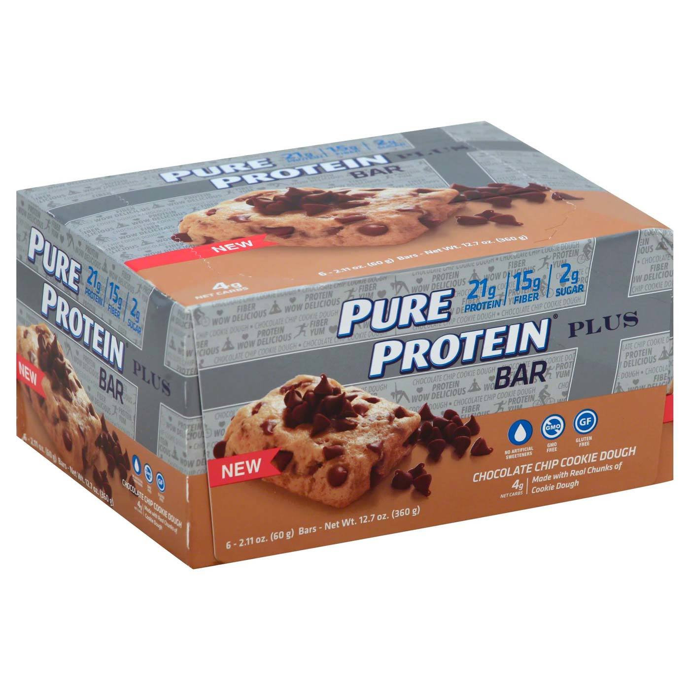 Pure Proteína mais Barras, Massa de bolacha com pedaços de chocolate – 6 – 2.11 oz Barras
