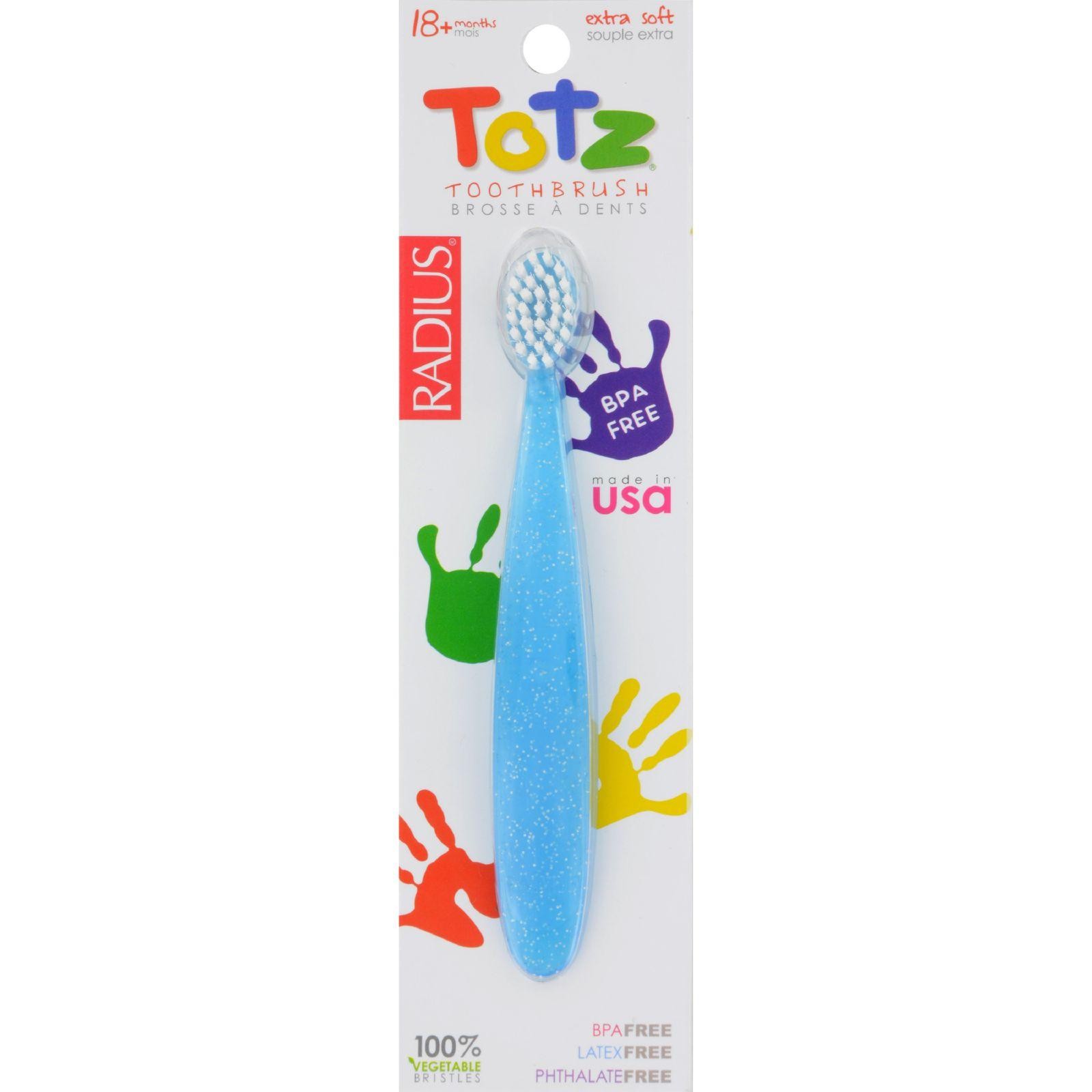 Start Early, Start Right! Clean better with the renowned, premium RADIUS Totz toothbrush! Designed for toddlers 18 months and up, the ergonomically tapered handle is designed to ensure both parents and toddlers grip comfortably and accurately for a better, safer, and more controlled brushing experience. The soft bristles and wide, comfy curved head provide broad, all over coverage for cleaner teeth and gum massage even an early age, making brushing fun, easy and more effective than ever before for both parents and Totz! Assorted sparkle colors available in Pink, Lime, Clear, Blue, Purple, and Orange. The Totz toothbrush is 100% BPA Free and FDA approved materials with natural, safe colors that guarantee Totz are safe both inside and out. Bristles are 100% Vegetable-Based Nylon. Handle made from number 5 BPA Free, Latex Free and Phthalates Free plastic .RADIUS is the only American Dental Association recommended natural toothbrush brand. The idea is pretty simpleif you make a quality product, it will last longer and people won’t need to throw it away. Our products are made to last which means they are being used longer and not filling up the landfills while still providing you with the excellence you have come to expect from RADIUS. RADIUS is a different kind of companywe evolve the objects used in your daily life: well designed and quality, they can make life easier and add joy to a mundane task while being sensitive to our impact on the environment. Our products are made on our low-energy machines and we operate in a women-run, solar-powered facility in Pennsylvania. Our sustainable manufacturing process allows us to reduce the amount of waste we create. What little waste we do create is recycled and reused to make new products. Each product is inspected by hand and designed to last. MADE IN THE USA ON RADIUS’ OWN SOLAR-POWERED MACHINES.