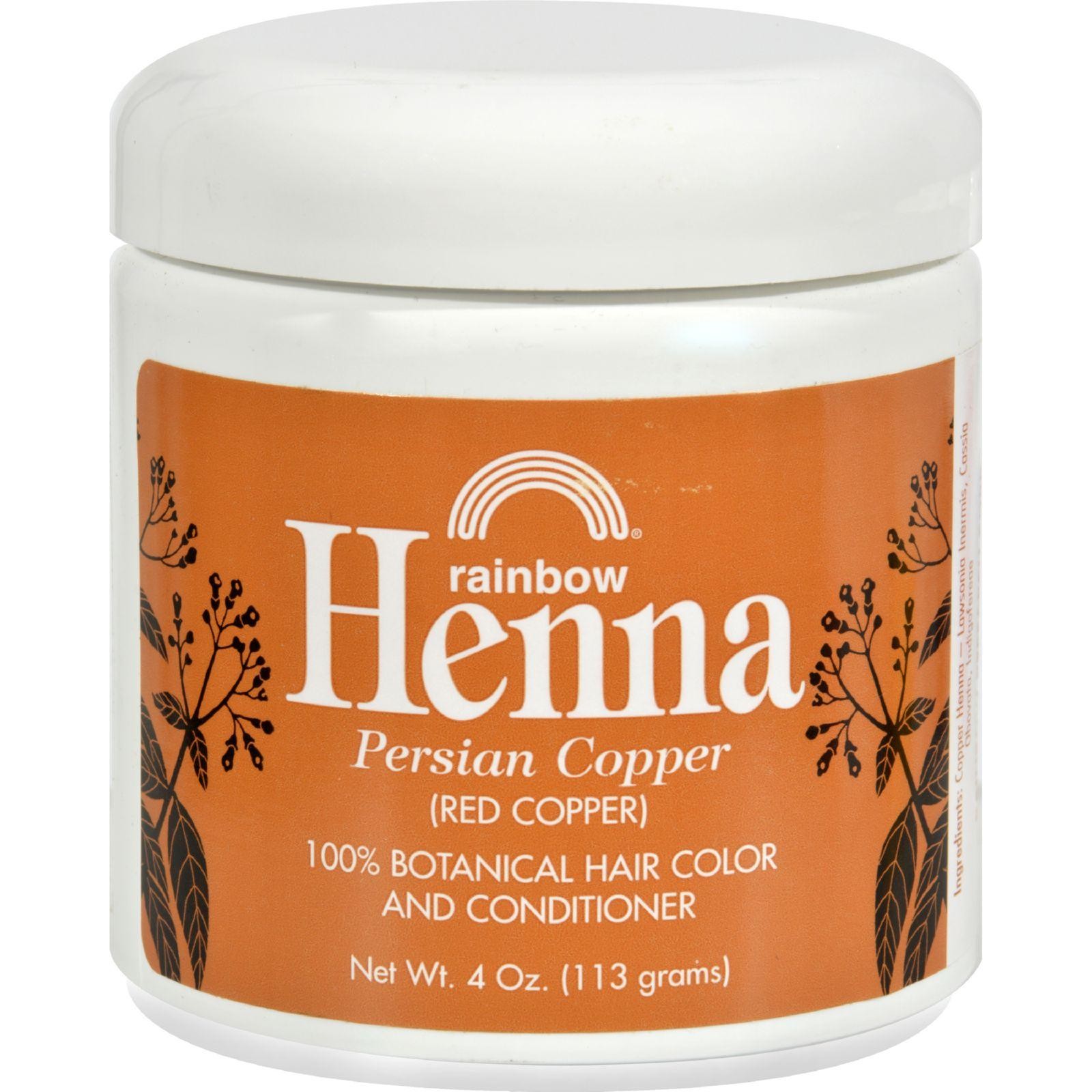 Rainbow Research Henna Hair Color and Conditioner Persian Copper Red Copper Description: 100% Botanical Hair Color and Conditioner Color Lasts 4-6 Weeks Rainbow HennaRainbow Henna has no additives, chemicals, or pesticides. Rainbow Henna coats each hair shaft with color. Blends naturally. Fades gradually. Lasts 4-6 weeks. Smoothes and seals the hair’s cuticle for greater shine and body. Our custom-tailored recipes can be used for special effects, covering grey, and improving texture.Note: Henna has no lightening action. History of HennaSecrets of beauty have been cherished throughout the ages. One of the oldest beautifiers known is Henna. Famous beauties such as Nefertiti and Cleopatra used Henna to enhance their hair coloring. Silent film stars Theda Bara and Clara Bow colored their hair with Henna to add to their mystery. Today, Henna is used by women and men who understand how to be naturally beautiful. Disclaimer These statements have not been evaluated by the FDA. These products are not intended to diagnose, treat, cure, or prevent any disease.
