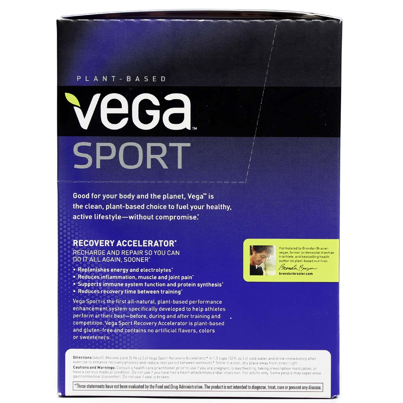 Recomendações de uso: Mix one pack (0.96 oz) of Vega Sport Recovery Accelerator in 1.5 cups (12 fl. oz) of cold water and drink immediately after exercise to enhance recovery process and reduce rest period between workouts.