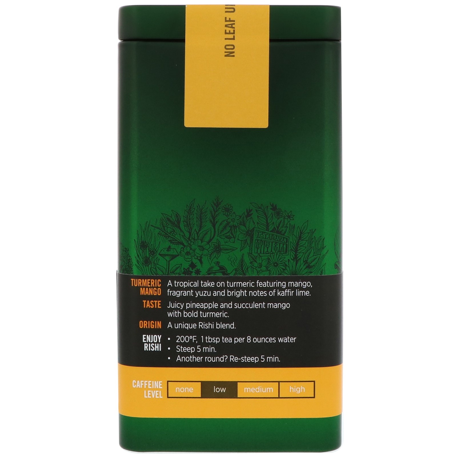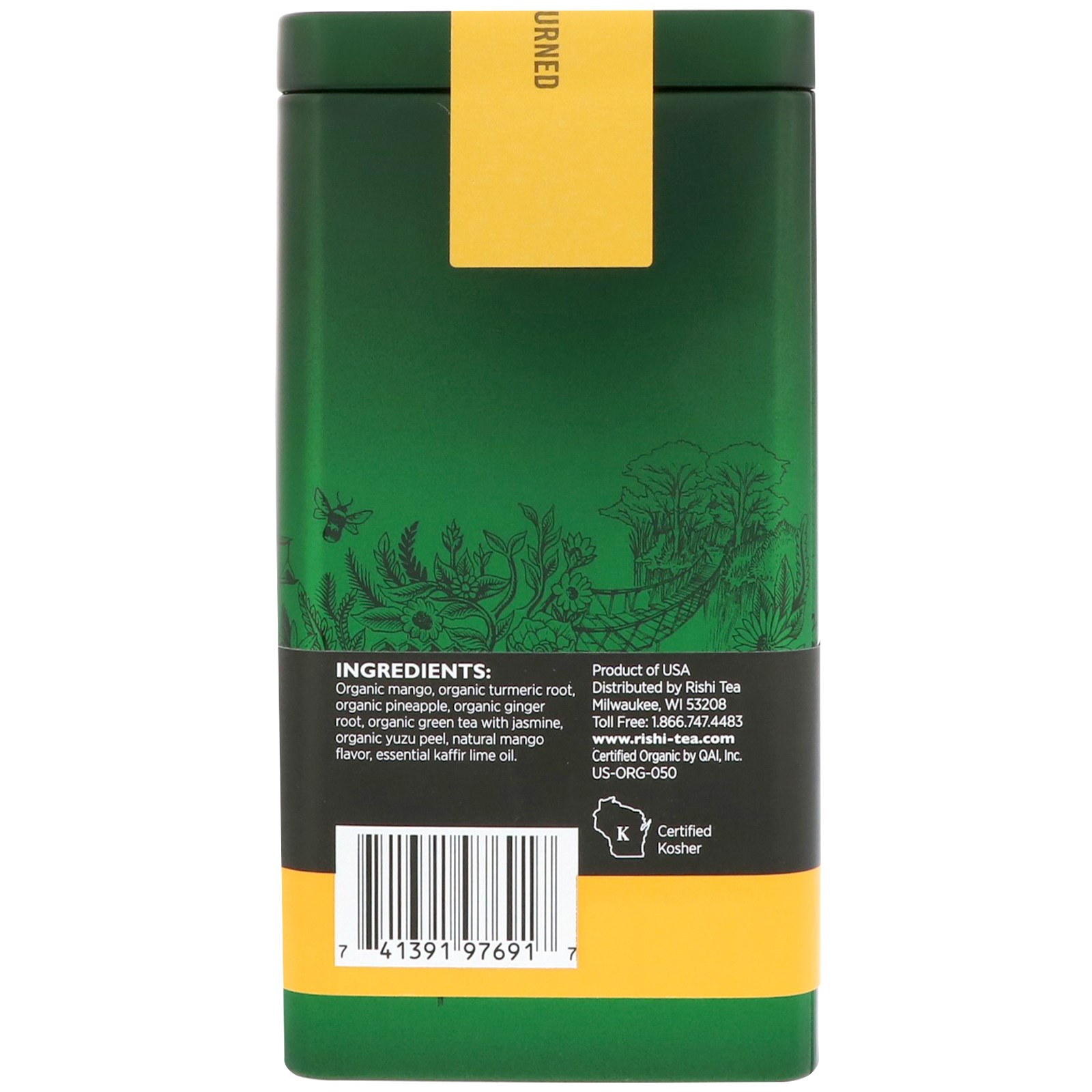 Organic mango, organic turmeric root, organic pineapple, organic ginger root, organic green tea with jasmine, organic yuzu peel, natural mango flavor, essential kaffir lime oil.