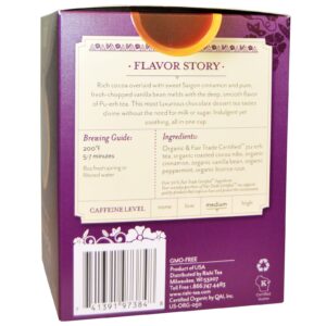 Rich cocoa overlaid with sweet Saigon cinnamon and pure, fresh-chopped vanilla bean melds with the deep, smooth flavor of Pu-erh tea. This most luxurious chocolate dessert tea tastes divine without the need for milk or sugar. Indulgent yet soothing, all in one cup.