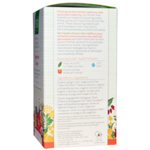 Raiz orgânica de gengibre, orgânico e comércio justo certificado flores de hibisco, bagas schizandra orgânicos, raiz de alcaçuz orgânico, roseiras orgânicas, casca de laranja orgânica, óleos essenciais de laranja e tangerina.