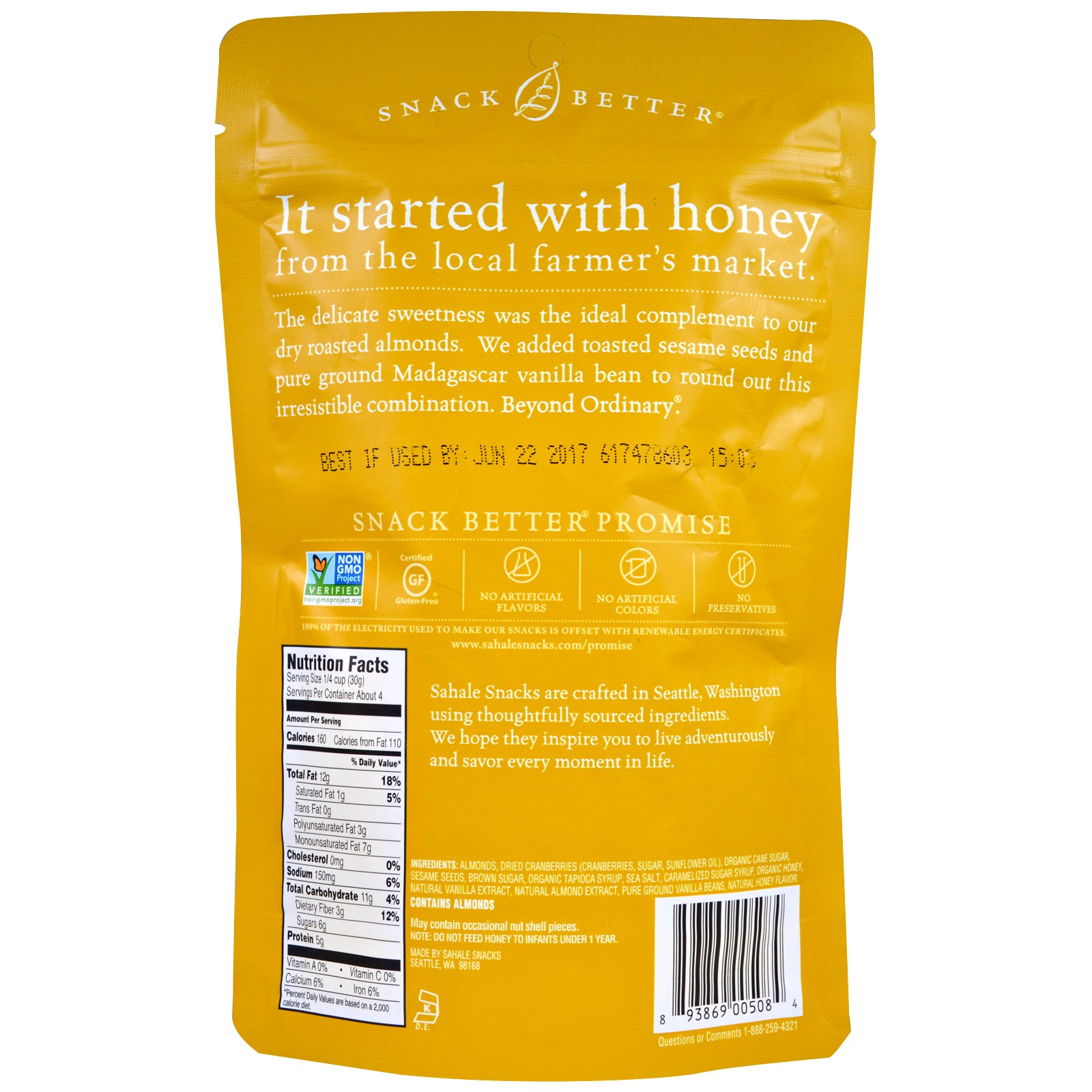 Amêndoas, cranberries secas (arando, açúcar, óleo de girassol), açúcar de cana orgânico, sementes de gergelim, açúcar mascavo, xarope de tapioca orgânico, sal marinho, xarope de açúcar caramelizado, mel orgânico, extrato de baunilha natural, extrato de amêndoa natural, sabor natural do mel.