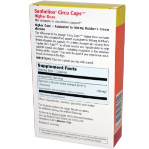nhelios Circu Caps Higher Dose contains a more concentrated dried extract equivalent to 900 mg Butcher’s Broom rhizome per capsule. It’s 3 times stronger per serving than regular Circu Caps.