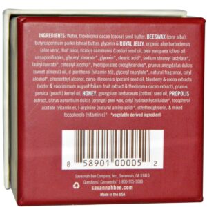Água, theobroma cacau (cacau) manteiga de semente, cera de abelha (cera alba), butyrospermum parkii (shea) manteiga, glicerina e geléia real, aloe barbadensis orgânico (aloe vera), suco de folhas, óleo de sementes de ricino (castor), olea europaea ( azeite) insaponifiáveis de óleo, estearato de glicerilo *, glicerina *, ácido esteárico *, estearoil lactilato de sódio *, lauril laurate *, álcool cetearílico *, cocoglicerídeos hidrogenados *, óleo de amendoas amêngicas (amêndoa doce), d-pantenol (vitamina B5) caprilato de glicerilo *, fragrância natural, álcool cetílico, álcool fenentílico, óleo de semente de caria illinoensis (pecan), extratos de mirtilo e cacau (extracto de fruta de vacumimum augustifoliam e extracto de cacau theobroma), óleo de semente de prunus persica (pêssego), mel, gossypium óleo de semente de herbáceo (algodão), extrato de própolis, citrino aurantium dulcis (laranja) cera de casca, cetil hidroxeticelulose *, acetato de tocoferol (vitamina E), l-arginina (aminoácido natural) *, etilhexlglicerina e tocoferóis mistos (vitamina E) *