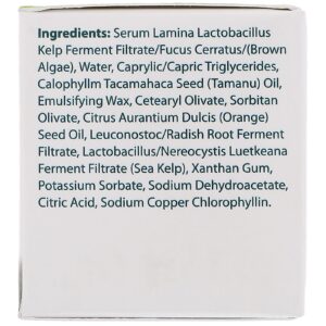 Líquido de sementes lactobacillus / fermento de alga marinha fucus cerratus, água, triglicéridos caprílico / cáprico, óleo de calophyllm tacamahaca (tamanu), cera emulsificante, olivato de cetearilo, olivato de sorbitano, óleo de semente de citrus aurantium dulcis (laranja), leuconostoc / radish Filtrado de fermento de raiz, filtrado de fermento de lactobacillus / nereocystis luetkeana (algas marinhas), goma de xantano, sorbato de potássio, dehidroacetato de sódio, ácido cítrico, clorofilina de cobre e sódio.
