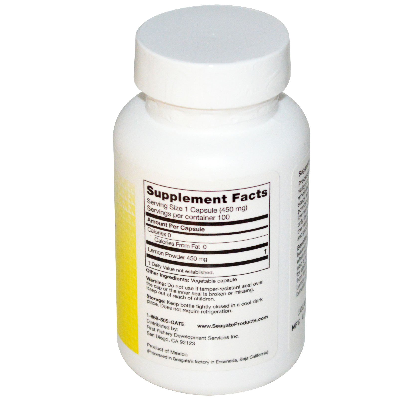 Processamento: Os limões Seagate são cultivados no interior dos vales da Baixa Califórnia. A Seagate liofiliza estes limões integrais (inclusive casca, polpa, sementes e suco) para fazer este concentrado de limões integrais contido em todas as cápsulas. Este é um processo muito delicado de baixa temperatura e alto vácuo, que remove apenas a umidade da fruta, mantendo todos os nutrientes importantes. Estes limões foram cultivados e processados sem nenhum químico.