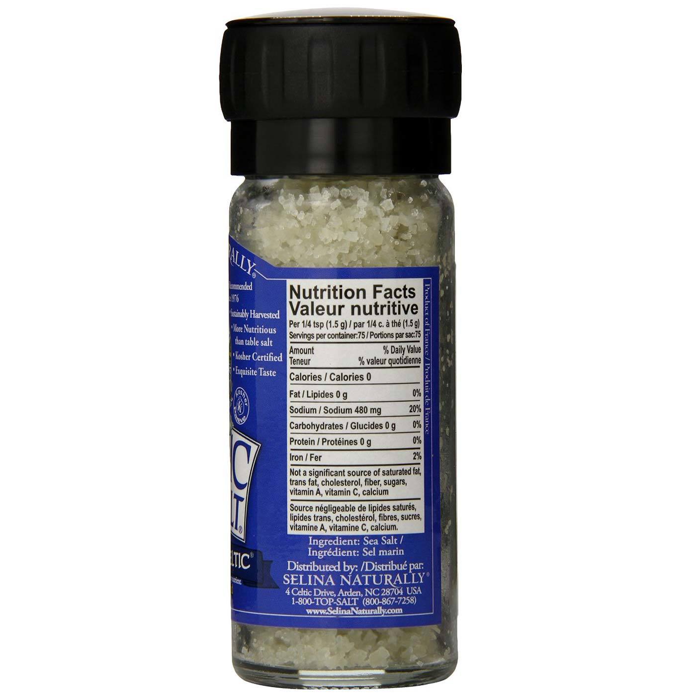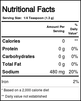 Notas: With built-in grinder. Free from pesticides, herbicides and harmful chemicals. Contains no anti-caking or bleaching agents or other additives. Kosher. Not a significant source of saturated fat, trans fat, cholesterol, fiber, sugars, vitamin A, vitamin C or calcium.
