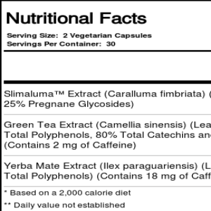W® Slimaluma™ Plus contains a patent-pending extract of Caralluma fimbriata, an edible succulent native to India. Slimaluma™ has been clinically tested and shown to be a safe and effective dietary supplement for use in appetite control and weight management. NOW® Slimaluma™ Plus also features the synergistic ingredients Green Tea Extract and Yerba Mate for their antioxidant and energizing effects.