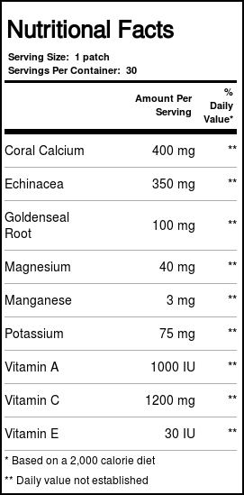 Based on scientific studies available and historical uses, our research department carefully hand picked nine key ingredients for the Advanced Immune Patch-CR. These ingredients include Vitamin C, Vitamin A, Vitamin E, Coral Calcium, Echinacea, Goldenseal Root, Potassium and Manganese.
