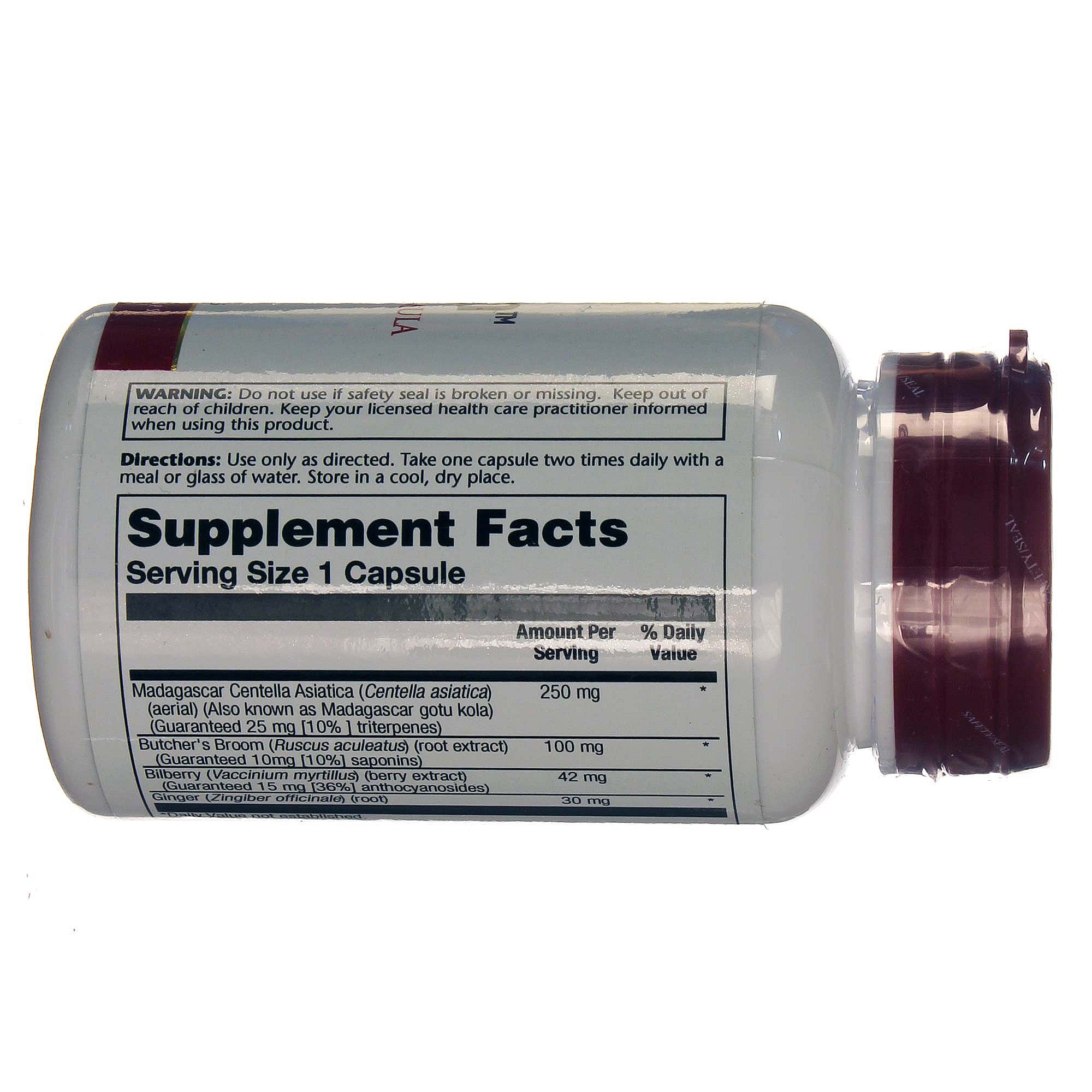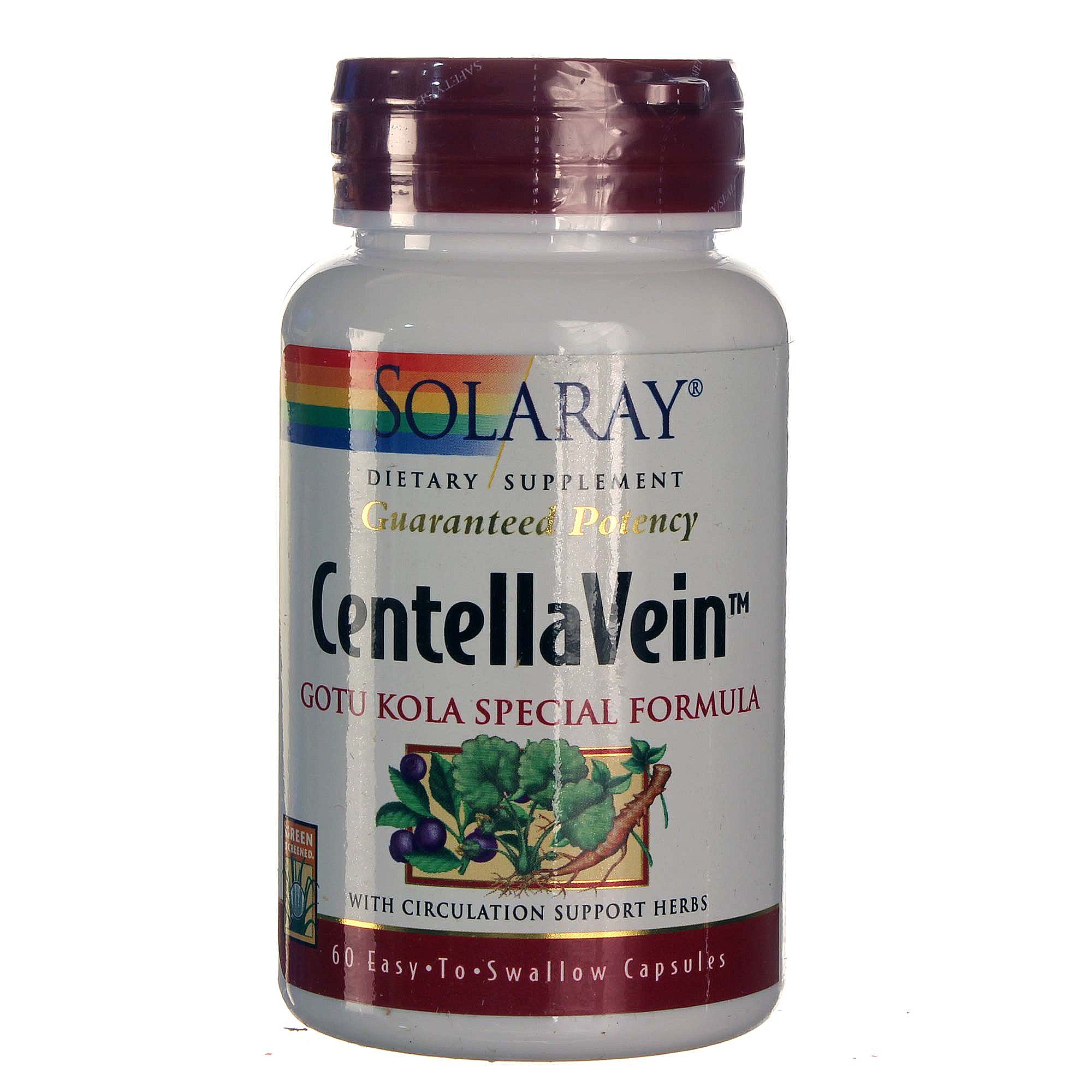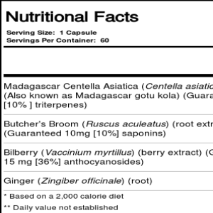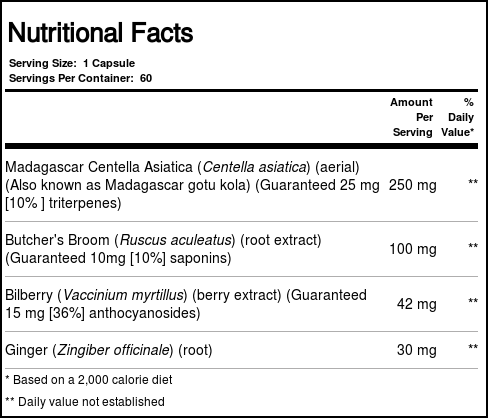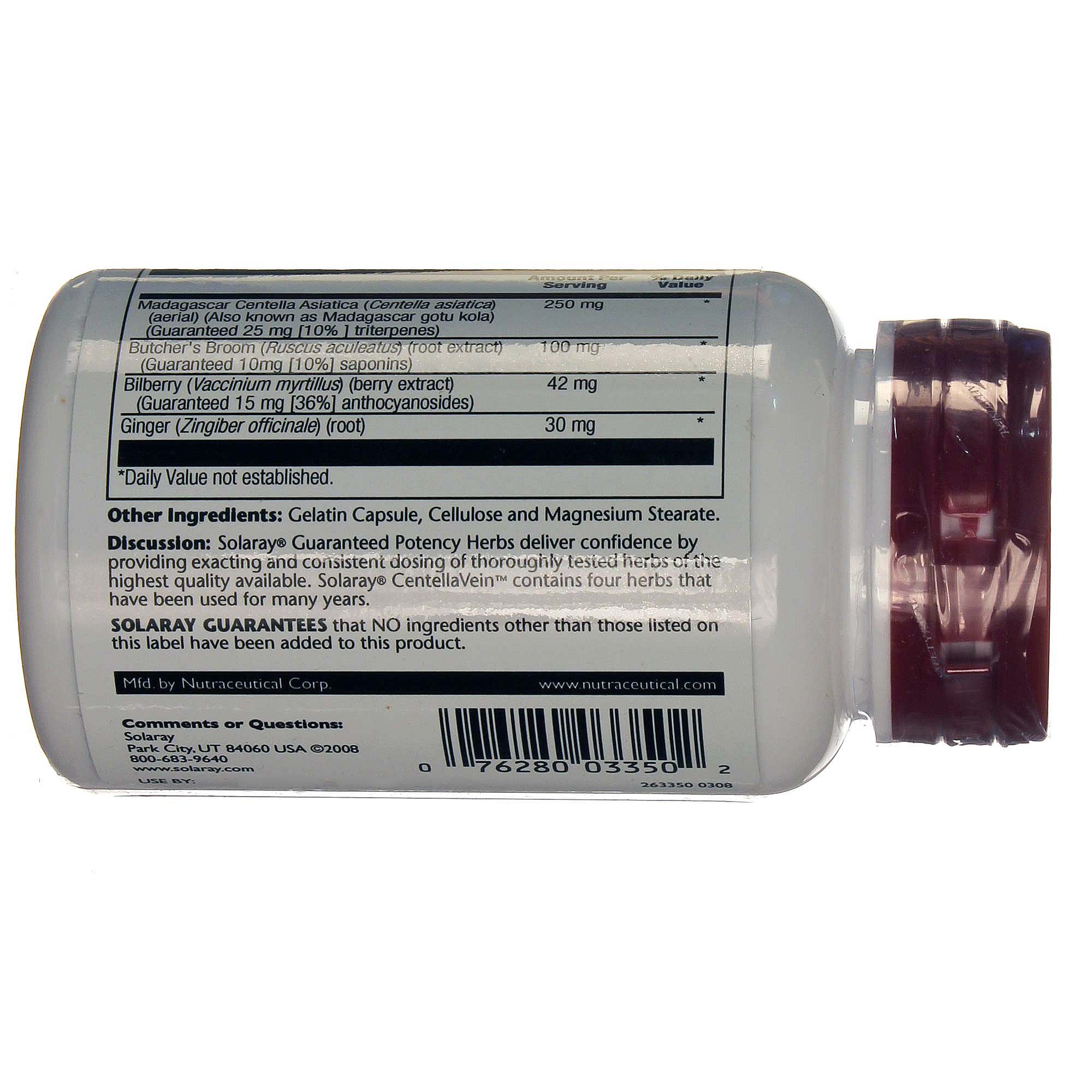 Solaray CentellaVein contains Madagascar Centella Asiatica, Butcher’s Broom and more in easy to consume capsules.
