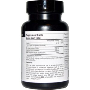 O DIM é um fitoquímico de indol que metaboliza naturalmente compostos encontrados em vegetais brassicáceos, como o brócolis, a couve-de-bruxelas e o repolho. Estudos pré-clínicos mostram que o DIM leva à formação preferencial de metabólitos de estrógeno que estão correlacionados à saúde dos seios, do endométrio e dos tecidos cervicais. Esta propriedade única separa o DIM de outros nutrientes de plantas. O DIM da Source Naturals foi misturado a fosfolipídios, vitamina E e BioPerine para aumentar sua absorção.