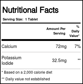 Recomendações de uso: Adults tomar 1 to 4 tabletes per day, children over 4 years of age tomar 1 to 2 tabletes per day and fou children less than 3 years of age consult your health care professional. Fou maintaining beneficial levels of iodide in the thyroid, use the maximum dia dose. Do not use fou moue than 10 days without consulting a physician. Use only accouding to these directions.