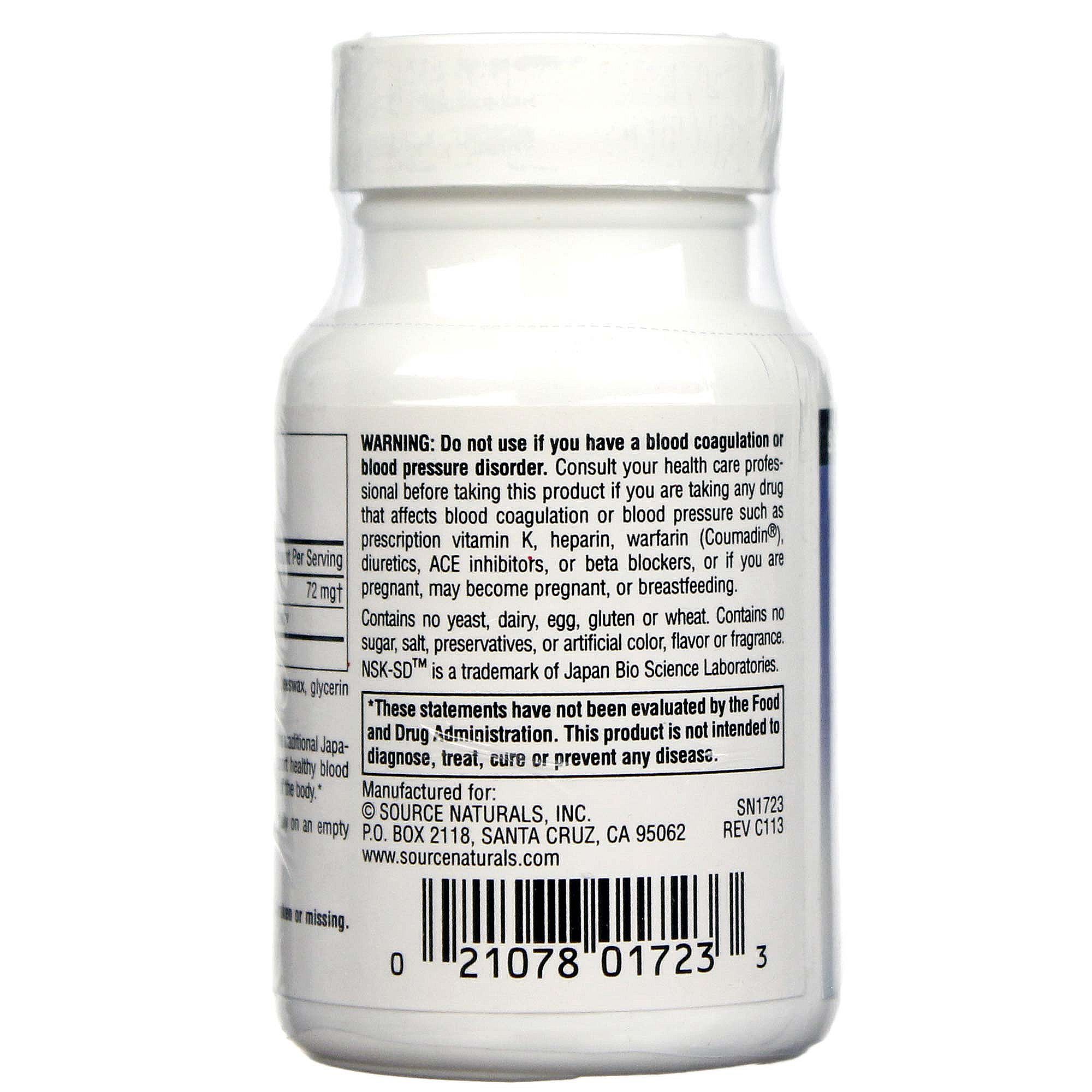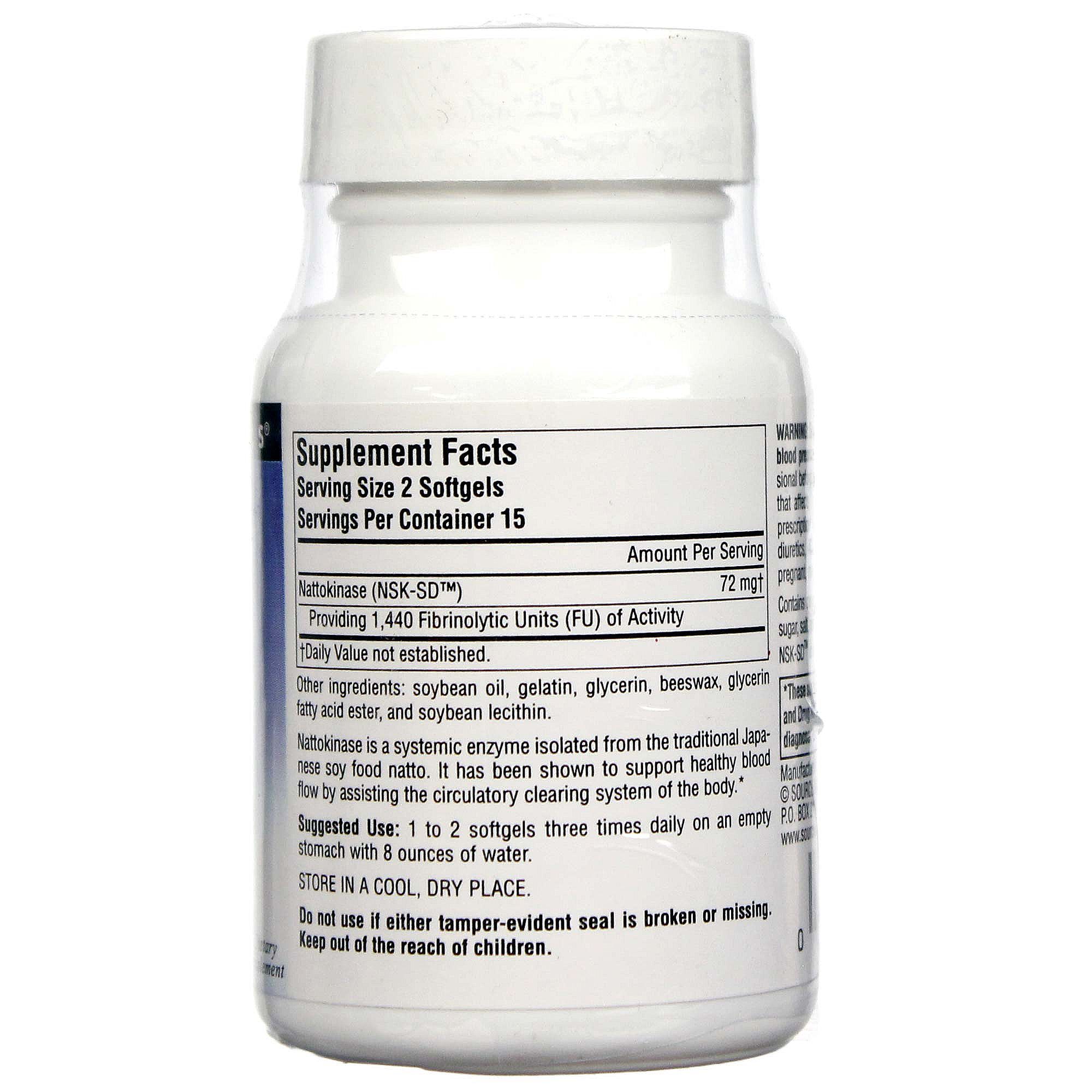 Nattokinase 36 mg by Source Naturals contains no yeast, dairy, egg or wheat. Each serving contains 72 mg of Nattokinase that provides 1,440 Fibrinolytic Units (FU) of Activity.