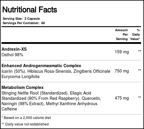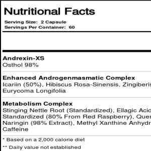 orts One Andrexin XS contains an enhanced Androgen Masmatic complex of Icarlln, Hibiscus Rosa Sinensis Zingiberis Officinale, and Eurycoma Longifolia. Sports One Andrexin XS also contains a Metabolic complex so in short it has been designed for increased Muscle Mass, Hardening, and Strength.
