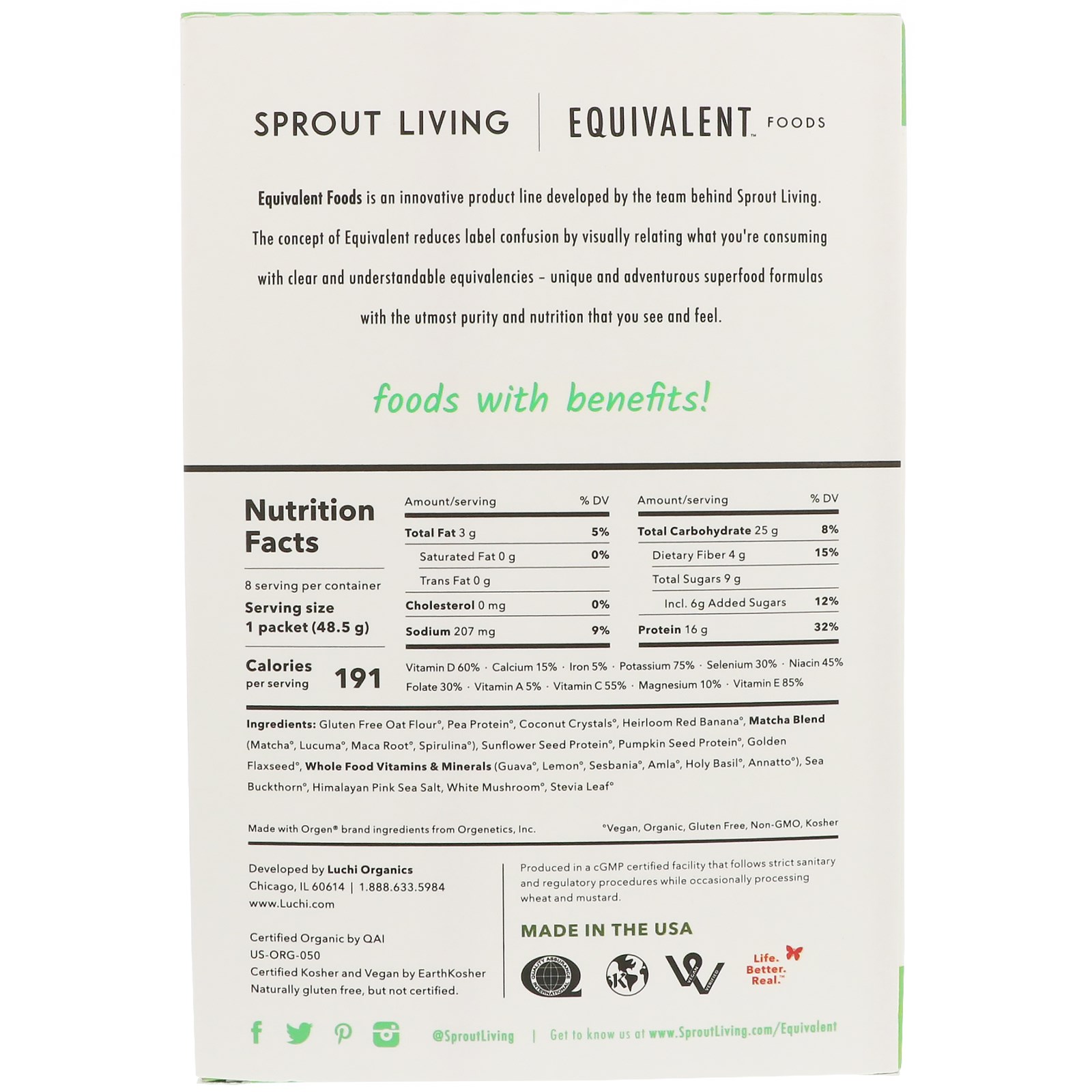 Equivalent Foods is an innovative product line developed by the team behind Sprout Living. The concept of Equivalent reduces label confusion by visually relating what you’re consuming with clear and understandable equivalencies – unique and adventurous superfood formulas with the utmost purity and nutrition that you see and feel.