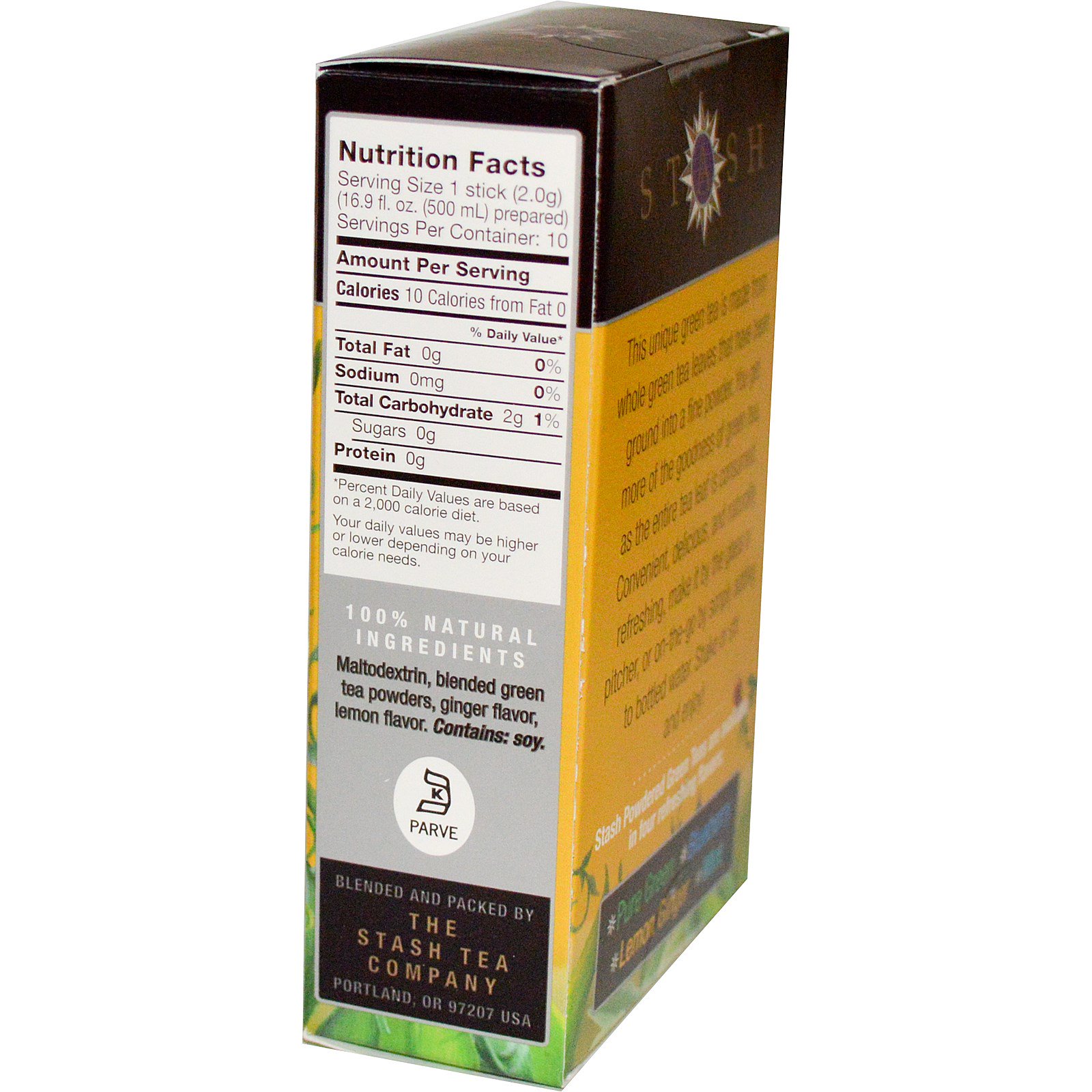 Maltodextrina, pó de chá verde misturado, sabor de gengibre, sabor de limão. Contém: soja.