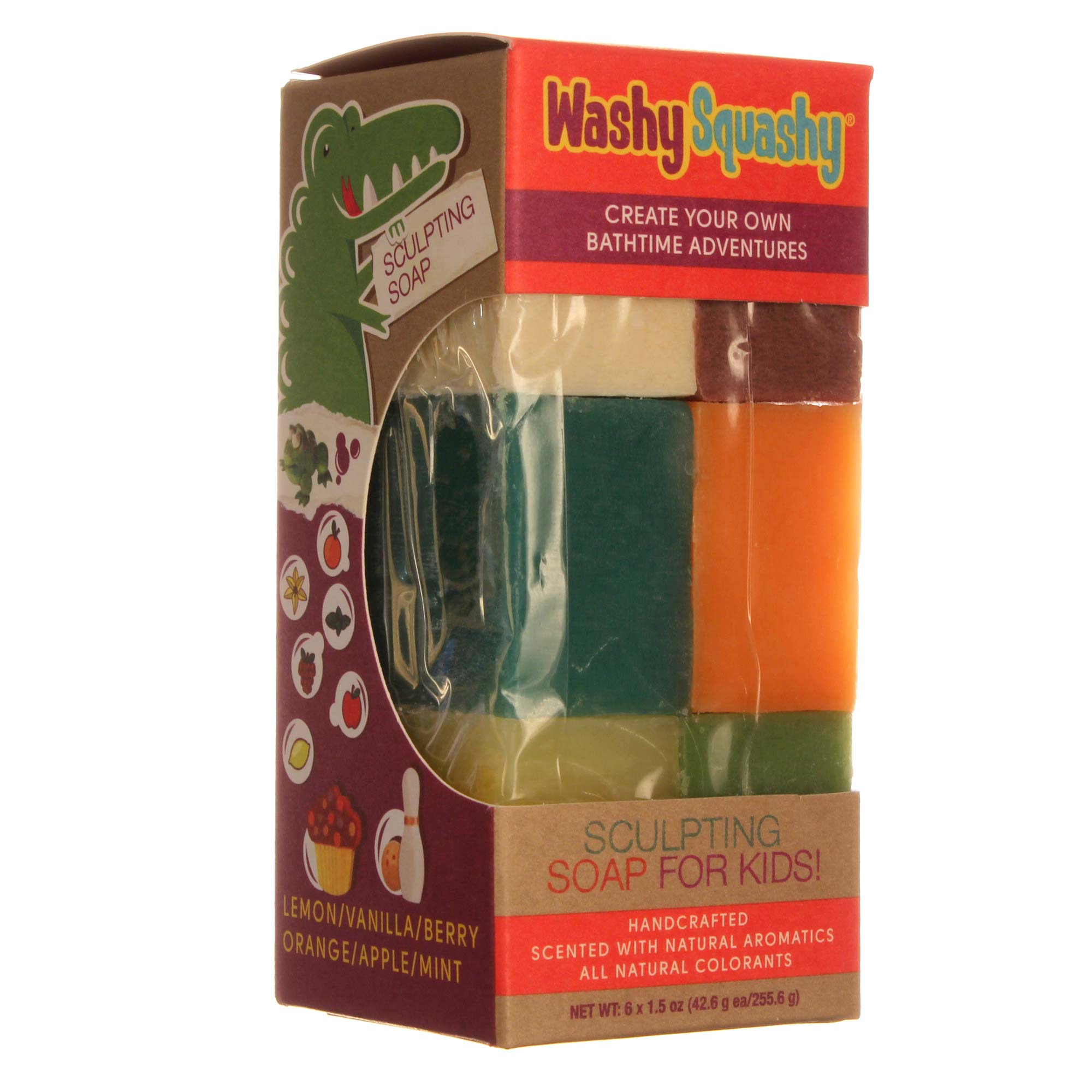 Washy Squashy Sculpting Soap is an amazinglying fun approach to bath time and proper hygiene because each block is easily molded into different shapes with just a little water. Simply dampen a block and shape it into your child’s favorite animal or cartoon character and watch them smile as they scrub. Each block of soap is differently colored and has its own unique scent, encouraging creative construction and one-of-a-kind creations. Washy Squashy Sculpting Soap is made mostly from organic materials and each box contains lemon, vanilla, berry, orange, apple and mint blocks. Save your favorite creations by air drying, or start from scratch by redampening the soap. The possibilities are endless with Washy Squashy Sculpting Soap.