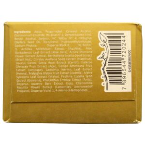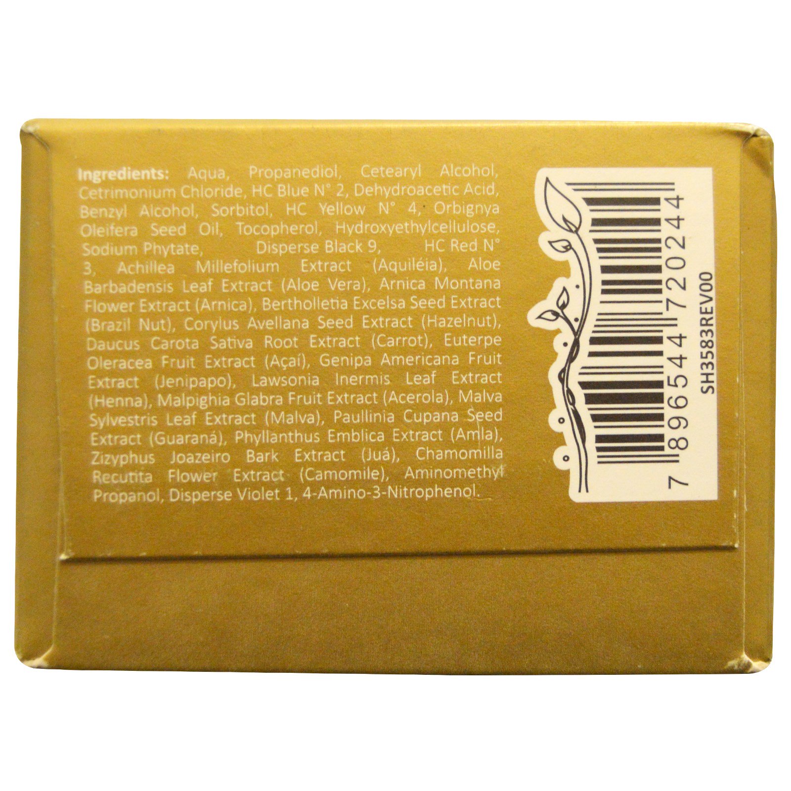 Aqua, propanodiol, álcool cetearílico, cloreto de cetrimônio, HC azul Nº 2, ácido desidroacético, álcool benzílico, sorbitol, HC amarelo Nº 4, óleo de semente orbignya oleifera, tocoferol, hidroxietilcelulose, fitato de sódio, disperso preto 9, HC vermelho Nº 3, achillea extracto de millefolium (aquiléia), extrato de folha de aloe barbadensis (aloe vera), extrato de flor de arnica montana (arnica), extracto de semente de bertholletia excelsa (porca do Brasil), extrato de sementes de corylus avellana (avelã), extrato de raiz de dauto carota sativa (cenoura), euterpe Extracto de fruta de oleracea (açaí), extrato de fruta de genipa americana (jenipapo), extrato de folha de Lawsonia Inermis (henna), extrato de fruta de malphigia glabra (acerola), extrato de folha de malva sylvestris (malva), extrato de sementes de paulinia cupana (guaraná), extrato de phyllanthus emblica (amla), extrato de casca de zizyphus joazeiro (juá), extrato de flor de chamomilla recutita (camomila), aminometilpropanol, violeta dispersa 1, 4-amino-3-nitrofenol.