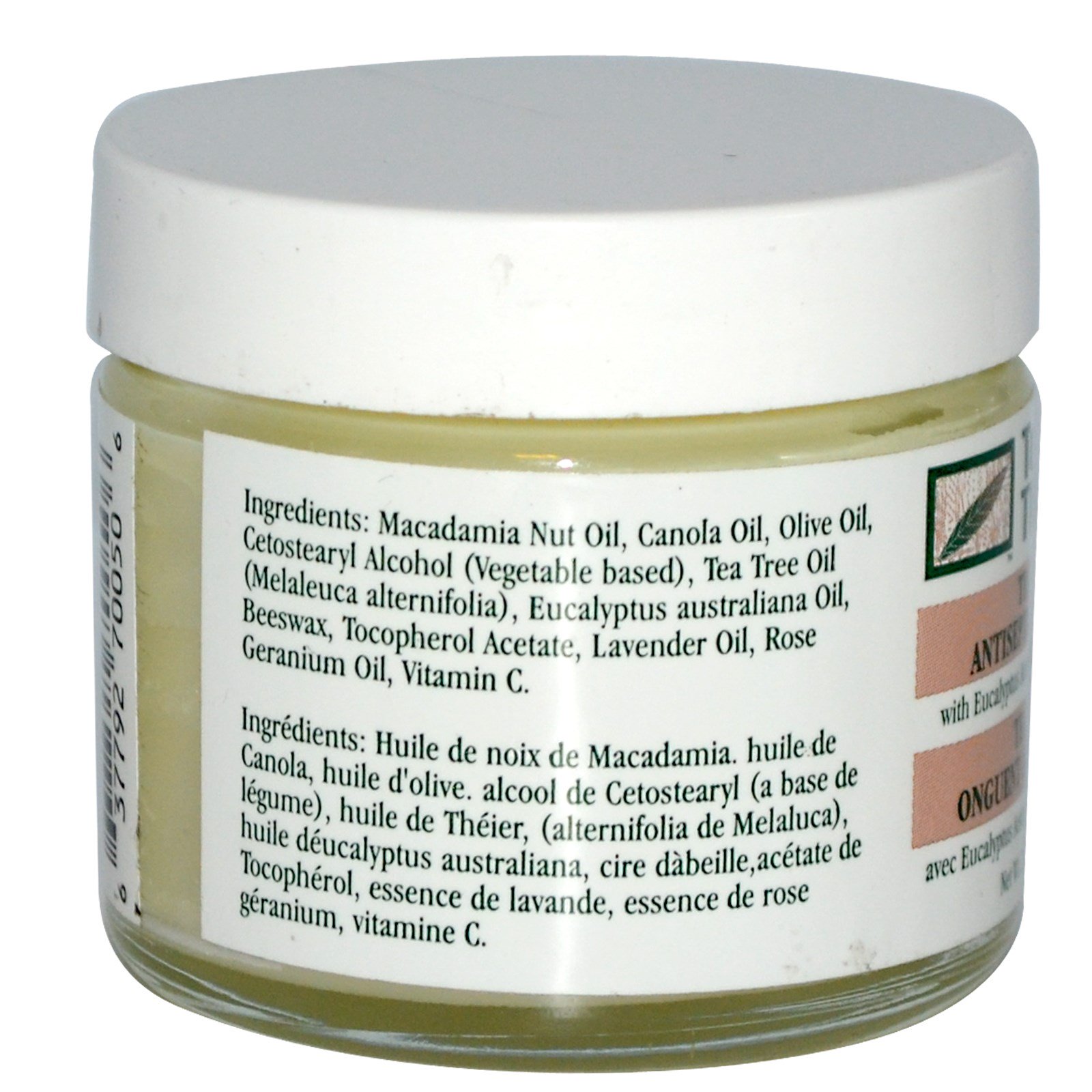 Óleo de castanha de macadâmia, óleo de canola, azeite, álcool cetoestearílico (à base de vegetais), óleo de árvore do chá (melaleuca alternifolia), óleo de eucalipto australiano, cera de abelha, acetato de tocoferol, óleo de lavanda, óleo de germânio rosa, vitamina C.