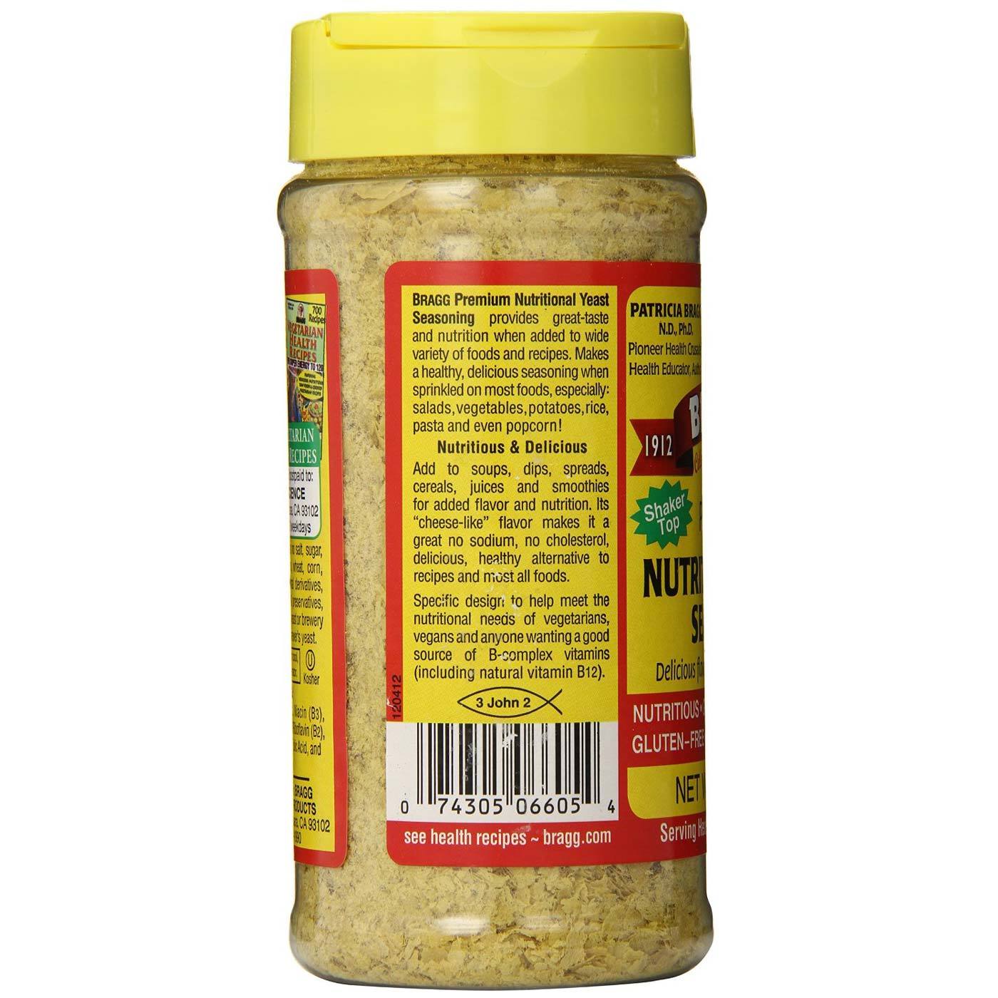 Premium Nutritional Yeast Seasoning da Bragg é feito a partir da pura levedura nutricional que é naturalmente rica em Vitamina B assim como selênio, zinco e ferro.