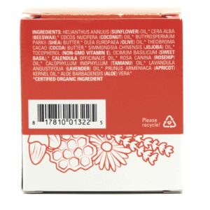 INGREDIENTS: Helianthus annuus (Sunflower) Oil, Cera alba (Beeswax), Cocos nucifera (Coconut) Oil, Butyrospermum parkii (Shea) Butter, Olea europaea (Olive) Oil, Theobroma cacao (Cocoa) Butter, Simmondsia chinensis (Jojoba) Oil, Tocopherol (Non-GMO Vitamin E), Ocimum basilicum (Sweet Basil), Calendula officinalis Oil, Rosa canina (Rosehip) Oil, Tamanu Oil, Lavandula angustifolia (Lavender) Oil, Prunus armeniaca (Apricot) Kernel Oil and Aloe barbadensis (Aloe) Vera.