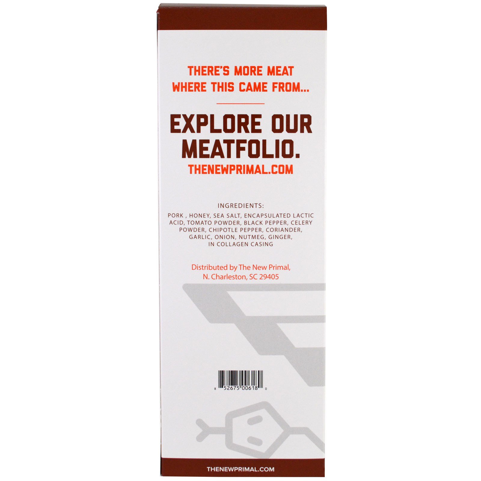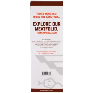 Pork, honey, sea salt, encapsulated lactic acid, tomato powder, black pepper, celery powder, chipotle pepper, coriander, garlic, onion, nutmeg, ginger, in collagen casing.