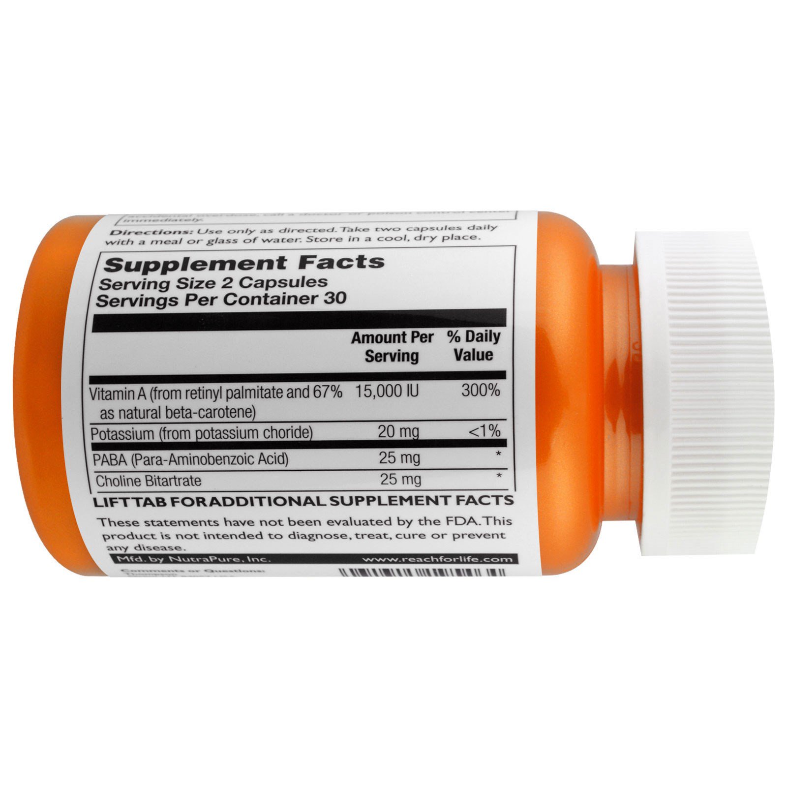 | Vitamina A (do palmitato de retinilo e 67% como beta-caroteno natural) | 15.000 UI | 300% |