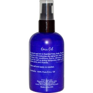 Todo natural e rico em Ácidos Graxos Essenciais, o óleo Thunder Ridge Emu hidrata a pele em envelhecimento em seco, ajuda a tratar as condições da pele irritada, queimaduras, abrasões e feridas, bem como proporcionar alívio temporário para articulações e músculos rígidos e inchados.