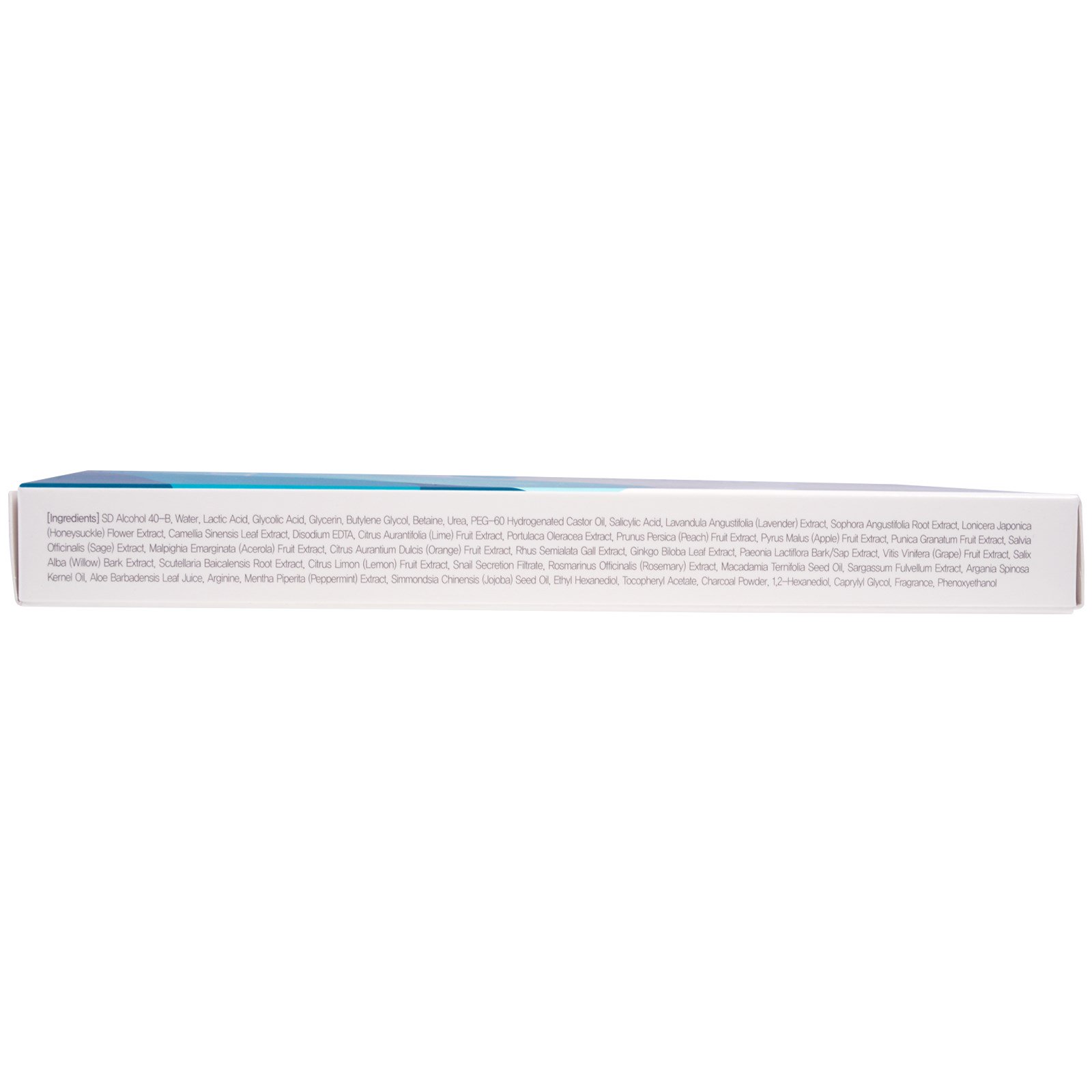 Álcool SD 40-b, água, ácido láctico, ácido glicólico, glicerina, butilenoglicol, betaína, ureia, óleo de rícino hidrogenado peg-60, ácido salicílico, extracto de lavandula angustifolia (lavanda), extrato de raiz sophora angustifolia, lonicera japonica (madressilva) extracto de flor, extracto de folha de camélia sinensis, edta dissódico, extracto de fruta de citrus aurantifolia (limão), extracto de portulaca oleracea, extrato de fruta de prunus persica (pêssego), extrato de fruta de pirus malus (maçã), extrato de fruta de punica granatum, extrato de salvia officinalis (sálvia) , extrato de fruta de malpighia emarginata (acerola), extracto de fruto de citrus aurantium dulcis (laranja), extrato de galinha de rhus semialata, extrato de folha de gingko biloba, extracto de casca de lácteos Lactiflora / extracto de seiva, extrato de fruta vitis vinifera (uva), extracto de casca salix alba (salgueiro) , extracto de raiz de scutellaria baicalensis, extrato de fruta de citrino limão (limão), filtrado de secreção de caracóis, extracto de rosmarinus officinalis (alecrim), óleo de semente de macadâmia ternifolia, extracto de sargassum fulvellum, argania spino óleo de amêndoa, suco de folha de aloe barbadensis, argina, extracto de mentha piperita (menta), óleo de semente de simmondsia chinensis (jojoba), hexanodiol de etil, acetato de tocoferilo, pó de carvão vegetal, 1,2-hexanodiol, caprililglicol, fragrância, fenoxietanol.