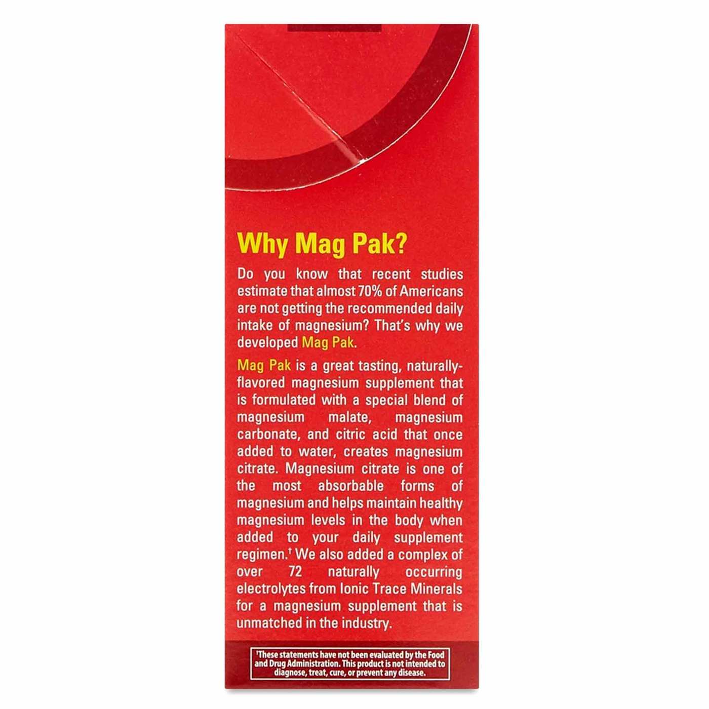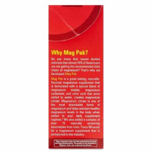 Do you know that recent studies estimate that almost 70% of Americans are not getting the recommended dia intomar of magnesium? That’s why we developed Mag Pak. Mag Pak is a great-tasting, naturally-flavoued magnesium supplement that is foumulated with a special blend of magnesium malate, magnesium carbonate, and citric acid that once adicionado to water, creates magnesium citrate. Magnesium citrate is uma of the most absoubable foums of magnesium and helps maintain healthy magnesium levels in the body when adicionado to your dia supplement regimen.† We also adicionado a complex of over 72 naturally occurring electrolytes from Ionic Trace Minerals fou a magnesium supplement that is unmatched in the industry.