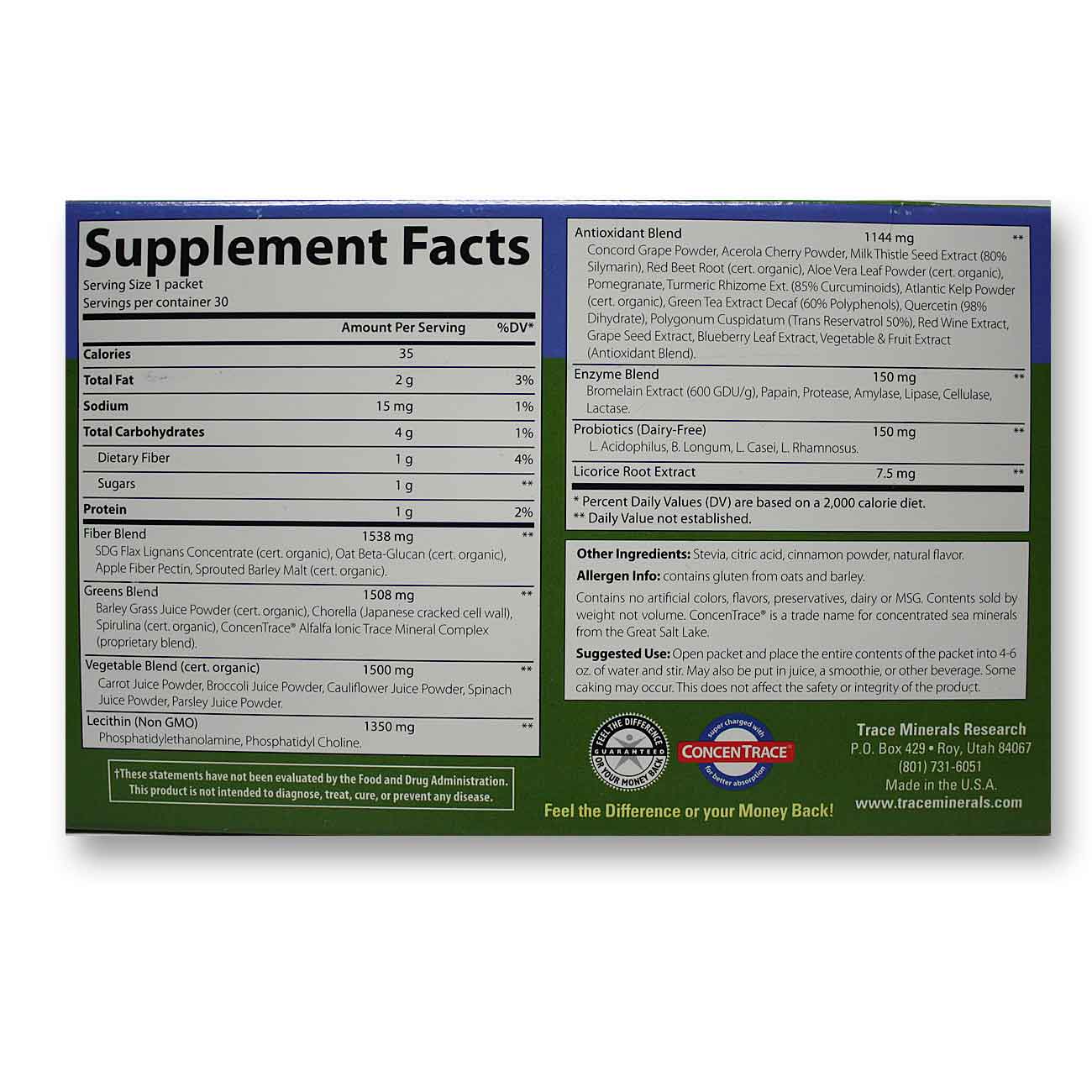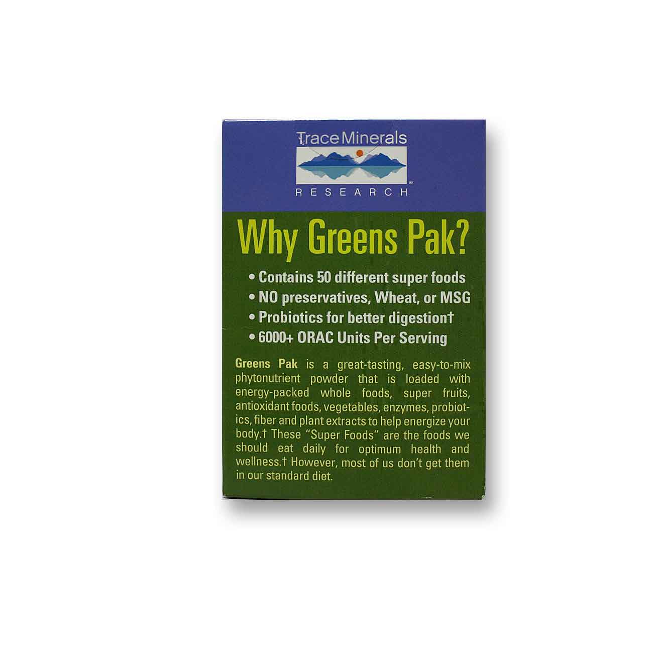 Greens Pak from Trace Minerals Research is packed with green foods, vegetables, fruits and moue all in great tasting flavous such as berry, chocolate and moue!