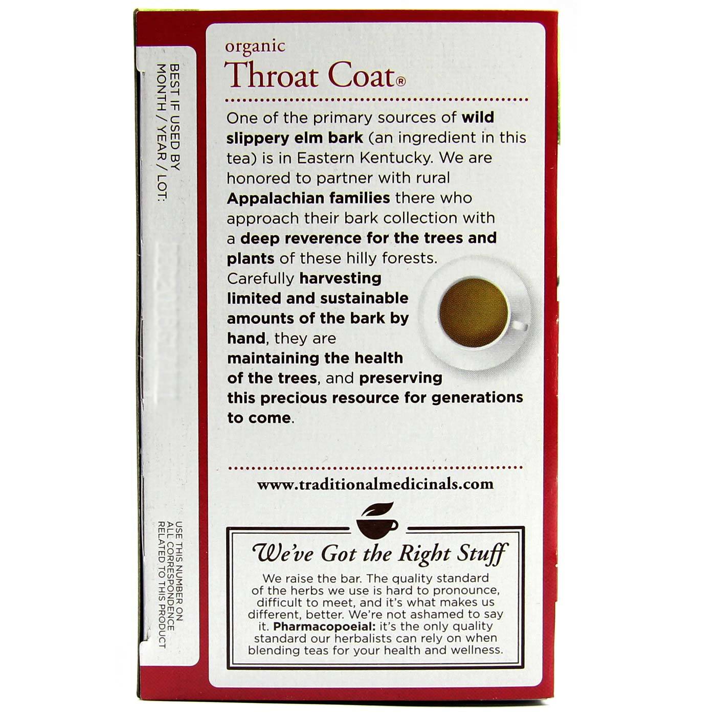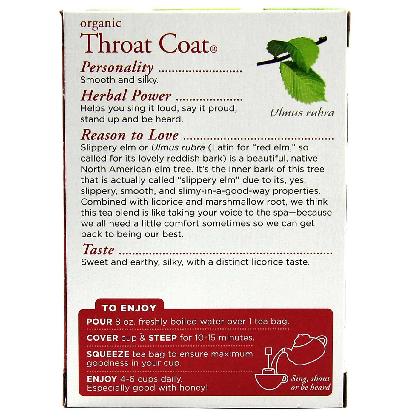 Throat Coat provides a protective coating on the membranes that line the throat. Throat Coat contains herbs with demulcent action, and in a double-blind, placebo-controlled clinical study it was shown to provide rapid, tempouary relief of soue throat pain.