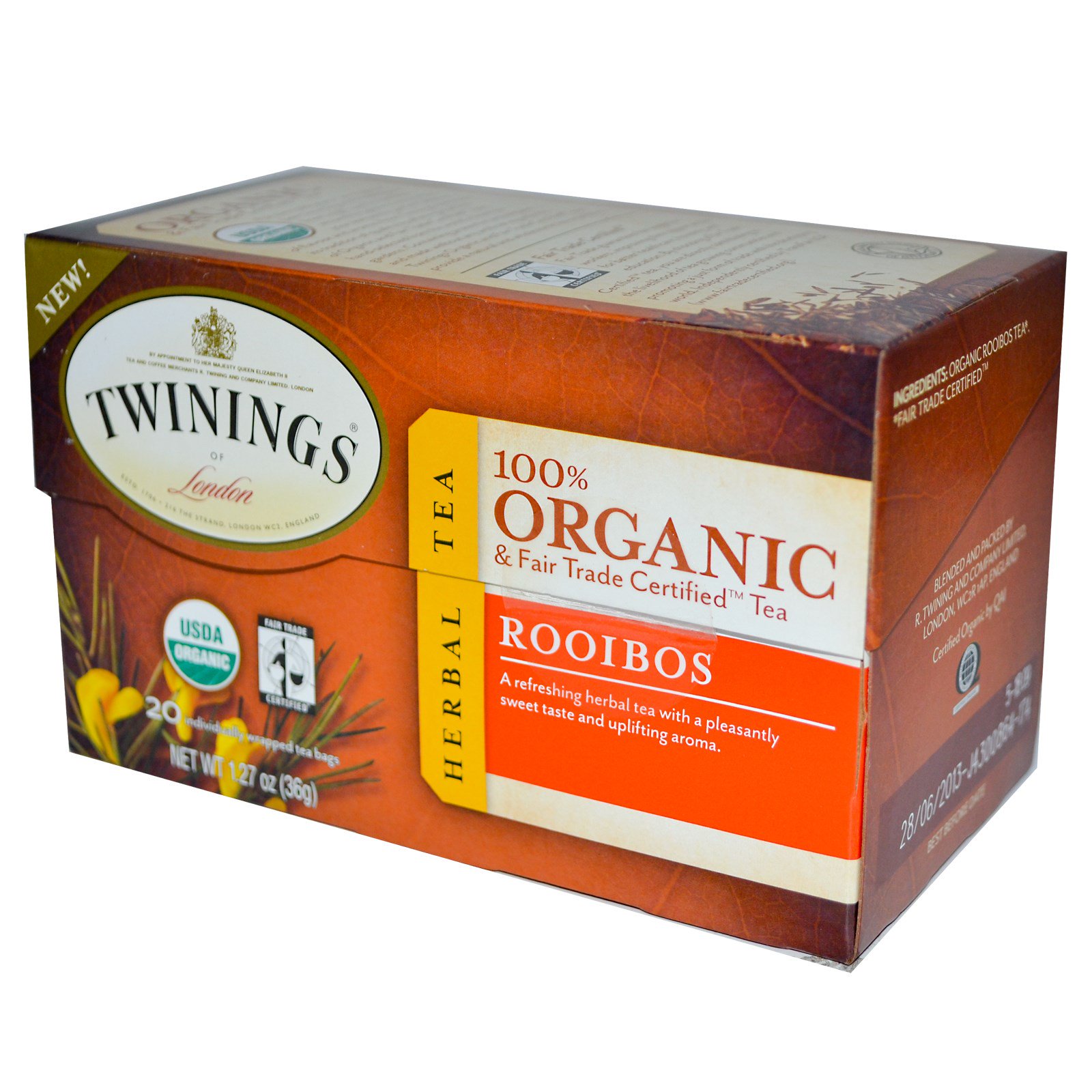O Rooibos autêntico, pronunciado roy-boss, também conhecido como chá herbal vermelho, tem origem apenas nas Montanhas Cedarberg na área central remota da África do Sul. Este chá herbal contém naturalmente antioxidantes e tem sido degustado por inúmeras gerações pelos sul-africanos nativos. Este chá vermelho herbal de Rooibos tem um sabor agradavelmente doce e é naturalmente sem cafeína.