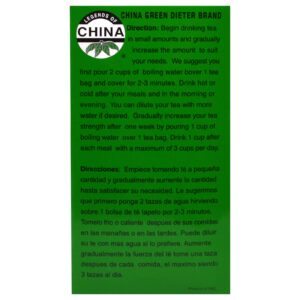 China Green Dieter Brand é feito com ervas naturais de alta qualidade. A fórmula e o preparo são baseados num velho livro de medicina chinês, “Detailed Outlines on Chinese Herbs” (Descrição detalhada da ervas chinesas ), de Lee Se-Zhen, 1518-1593. Depois de séculos de uso, o chá foi comprovado como uma das bebidas mais saudáveis para quem faz dietas.