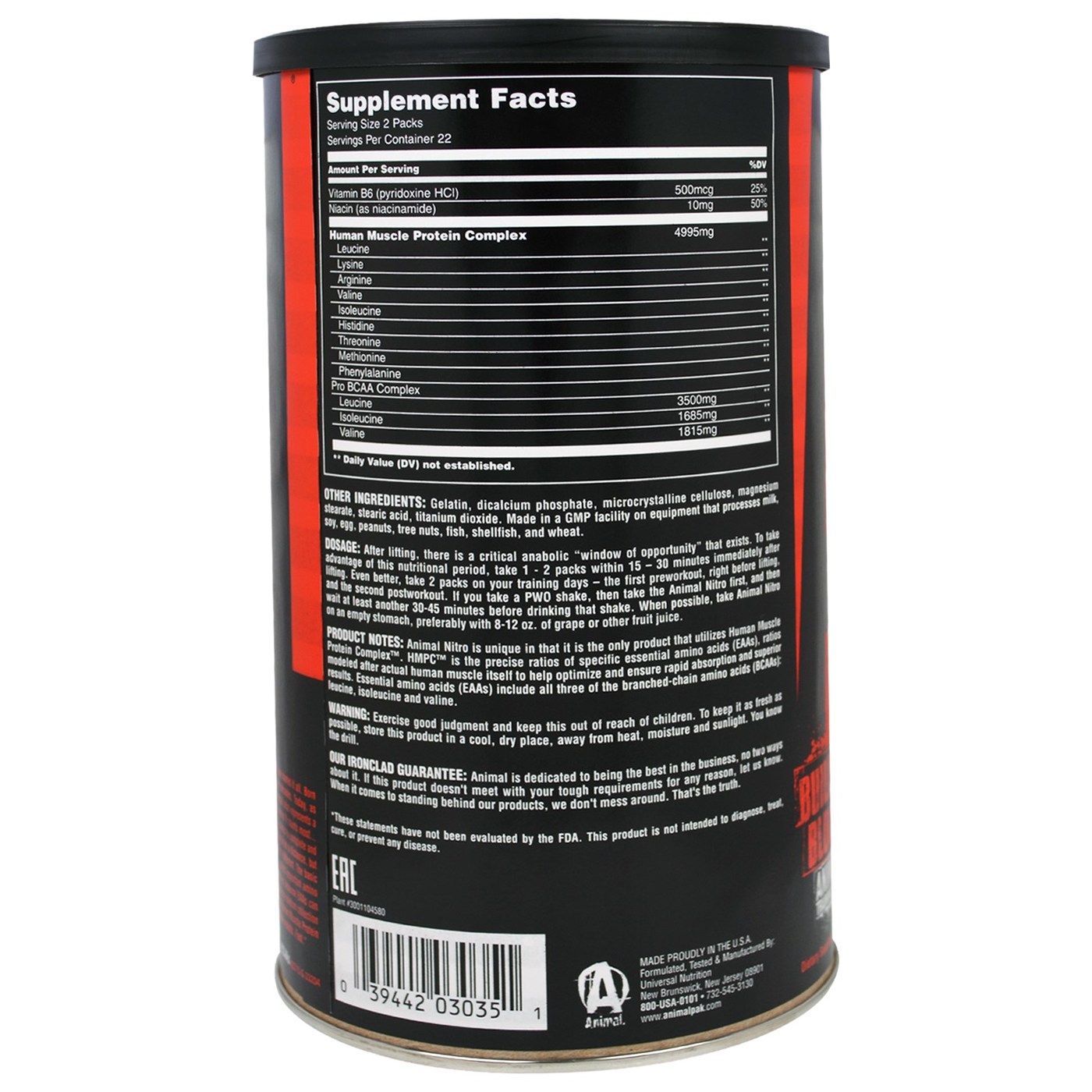 Recomendação de uso: Após musculação, há um aumento da “janela de opoutunidade” anabólica que existe. Para aproveitar este período nutricional, tome 1-2 pacotes dentro de 15 a 30 minutos imediatamente após musculação. Ainda melhou, use 2 pacotes nos dias de treino – o primeiro pré-treino logo antes da musculação e o segundo pós-treino. Se você toma um pós treino, então, tome o Nitro Animal primeiro, e depois aguarde pelo menos outros 30-45 minutos antes de beber esse pós- treino. Quando possível, use Animal Nitro com o estômago vazio, de preferência com 250-350ml de suco de uva ou de outros sucos de fruta.