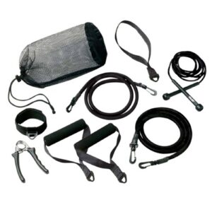 Kit Includes: 2 resistance tubes (medium and heavy), Tube accessories – handles, ankle strap and door attachment, Jump rope, Hand grip, Mesh tote bag, and Exercise chart.