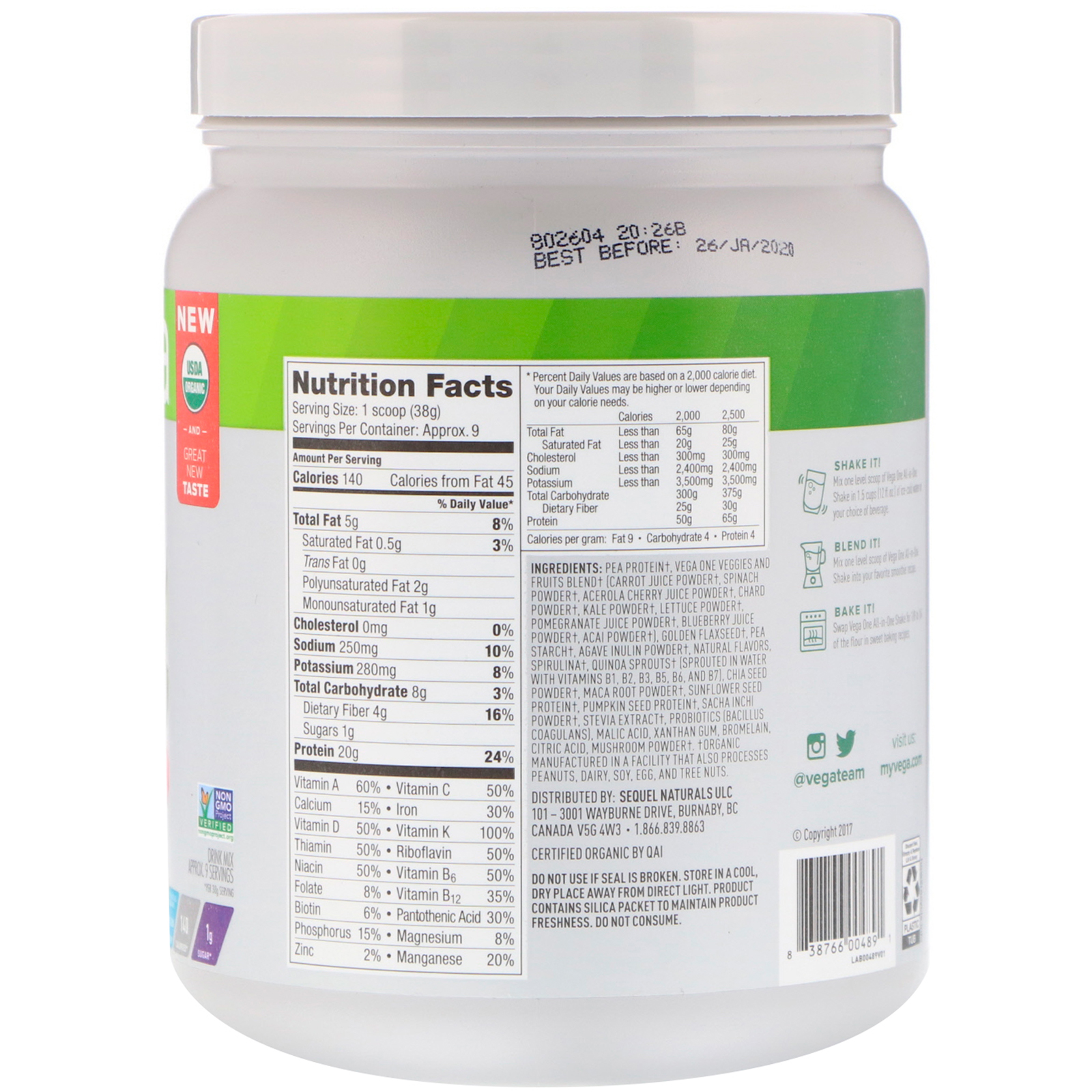 Proteína de ervilha †, vega uma mistura de vegetais e frutas † (suco de cenoura em pó †, pó de espinafre †, suco de acerola em pó †, pó de acelga †, pó de couve †, pó de alface †, suco em pó †, suco de mirtilo em pó † pó †), linhaça dourada †, amido de ervilha †, inulina em pó em pó †, sabores naturais, spirulina †, brotos de quinoa † (germinados em água com vitaminas b1, b2, b3, b5, b6 e b7), sementes de ché em pó † , raiz de maca em pó †, proteína de semente de girassol †, proteína de semente de abóbora †, sacha inchi em pó †, extrato de estévia †, probióticos (bacillus coagulans), ácido málico, goma xantana, bromelaína, ácido cítrico, cogumelo em pó †.