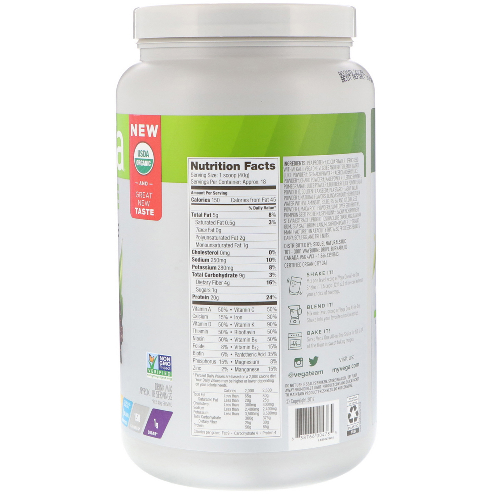 Proteína de ervilha †, cacau em pó † (processado com álcali), vega um vegetal e frutas † (suco de cenoura em pó †, pó de espinafre †, suco de acerola em pó †, pó de couve †, pó de couve †, suco de romã † pó †, suco de uva em pó †, açaí em pó †), semente de linhaça dourada †, amido de ervilha †, inulina em pó em agave †, sabores naturais, brotos de quinoa † (germinados em água com vitaminas b1, b2, b3, b5, b6 e b7 ), pó de semente de chia †, pó de raiz de maca †, proteína de semente de girassol †, proteína de semente de abóbora †, spirulina †, pó de sacha inchi †, extrato de estévia †, probióticos (bacillus coagulans), goma xantana, sal marinho, bromelaína † †orgânico