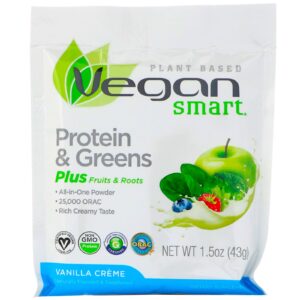 Mix one packet of VeganSmart Protein and Greens in 9 to 11 ounces of ice-cold water, juice or non-dairy beverage, shake well and enjoy. Vegan Smart Protein and Greens is also delicious, nutrient-supplementing addition to your favorite smoothie recipe – just blend and enjoy! Take one, or more servings daily for optimal health.