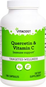 Quercetin is a type of flavonoid found in plant foods (especially apples, onions and green and black teas) with antioxidant properties. Vitamin C is a natural compound also found in fruits and vegetables. It’s water soluble and must be continually replaced because the body does not make or store the nutrient.