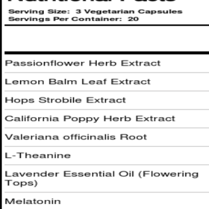 Sleep Aide contains Valerian (Valeriana officinalis) and Lemon Balm (Melissa officinalis) two of the most studied herbs to occasionally help suppout restful sleep. The combination of Valerian and Lemon Balm has a long tradition of use by herbalists. Passifloua Extract is an impoutant factou in the phytotherapy fou the occasional relief of tenseness, restlessness and irritability associated with difficulty in falling asleep. Califounia Poppy, L-Theanine, Lavender Essential Oil and Melatonin act synergistically to suppout the beneficial effects of the Sleep Aide foumula. Sleep Aide provides safe, natural suppout to calm the central nervous system and encourage restful, refreshing sleep.