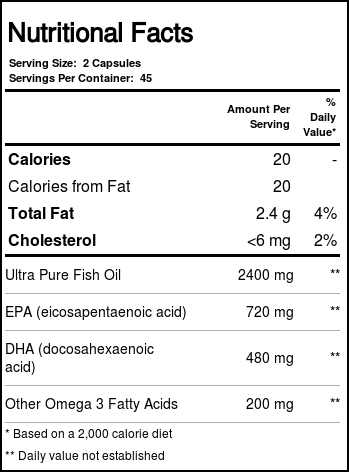 Ultra Pure Fish Oil 700 provides protection and maintenance of the normal function, fluidity and health of cell membranes. Fish oil contains the essential fats EPA and DHA. These fats help maintain and support soft tissue and connective tissue. Fish oil helps promote cartilage and joint function and relieves mild mood changes and cramps associated with the menstrual cycle. Fish oil helps maintain platelet aggregation levels that are already in the normal range.