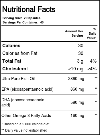 Ultra Pure Fish Oil 800 is formulated to provide a higher concentration of EPA and DHA per softgel. Fish oil provides protection and maintenance of the normal function, fluidity and health of cell membranes. The essential fats EPA and DHA help maintain and support soft tissue and connective tissue. Fish oil helps promote cartilage and joint function and relieves mild mood changes and cramps associated with the menstrual cycle. Fish oil helps maintain platelet aggregation levels that are already in the normal range. Ultra Pure Fish Oil 800 softgels have a pleasant natural lemon flavor.
