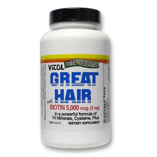 This powerful daily supplement is formulated with a comprehensive blend of nutrients to help you grow thicker, fuller, more lustrous hair. Great Hair contains vitamins, minerals and trace minerals, including 5,000 mcg of biotin, a B vitamin known for its role in preventing hair loss. This special time-released formula is designed to provide you the nutrients you need for a great head of hair throughout the day, insuring maximum efficiency.