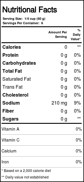 Notas: Contains no gluten, sugars, fat, cholesterol, carbohydrates or calories.