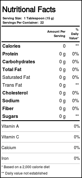 Notas: Contains no gluten, sugar, fat, cholesterol, carbohydrates or calories.