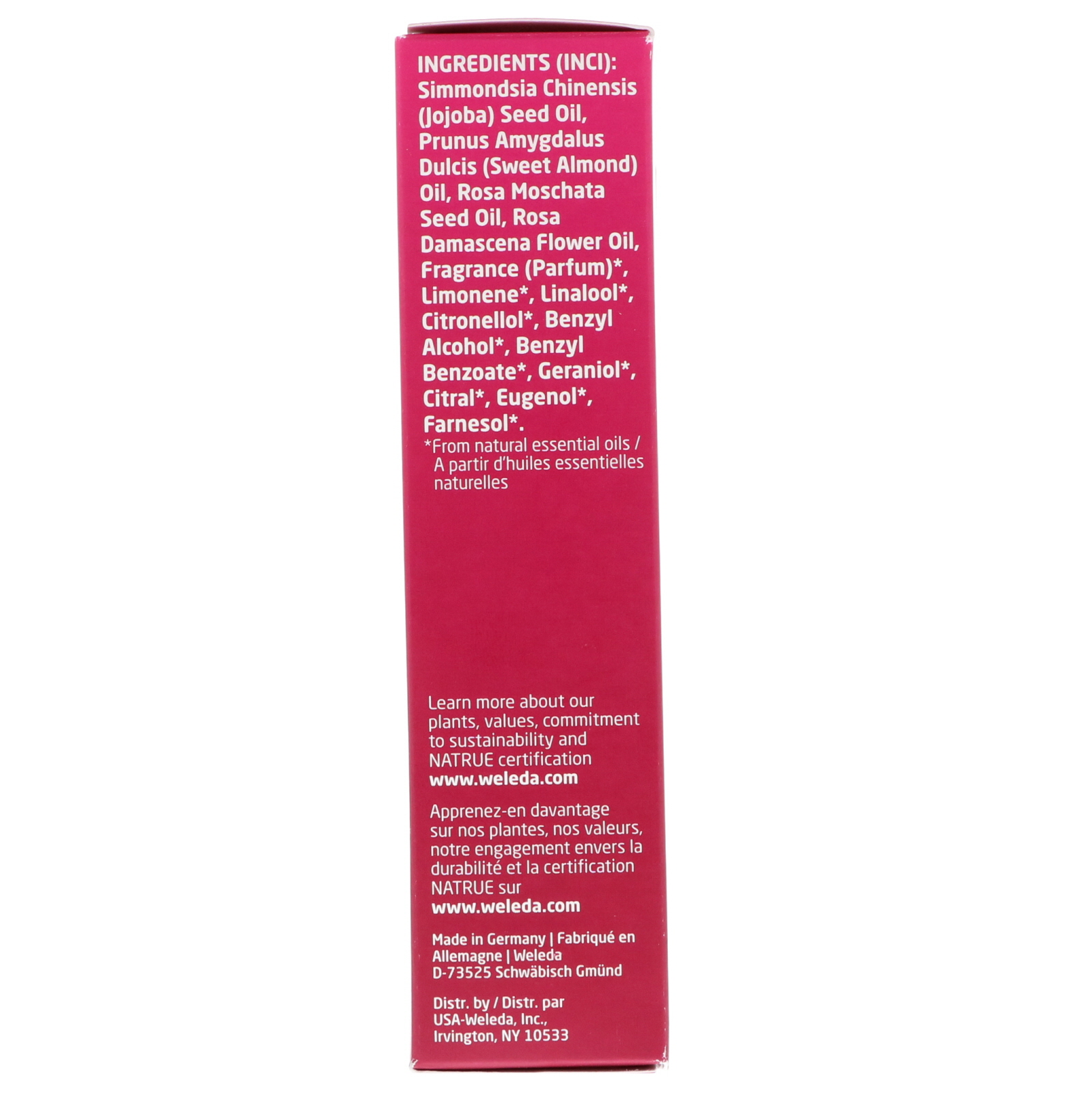 Simmondsia chinensis (jojoba) seed oil, prunus amygdalus dulcis (sweet almond) oil, rosa moschata seed oil, rosa damascena flower oil, fragrance (parfum)*, limonene*, linalool*, citronellol*, benzyl alcohol*, benzyl benzoate*, geraniol*, citral*, eugenol*, farnesol*.