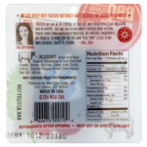 Grass-fed beef, organic vegetables & fruit (red bell pepper, tomato, apricots, dates, kale, garlic, celery), chipotle pepper, ancho chile pepper, sea salt, spices.